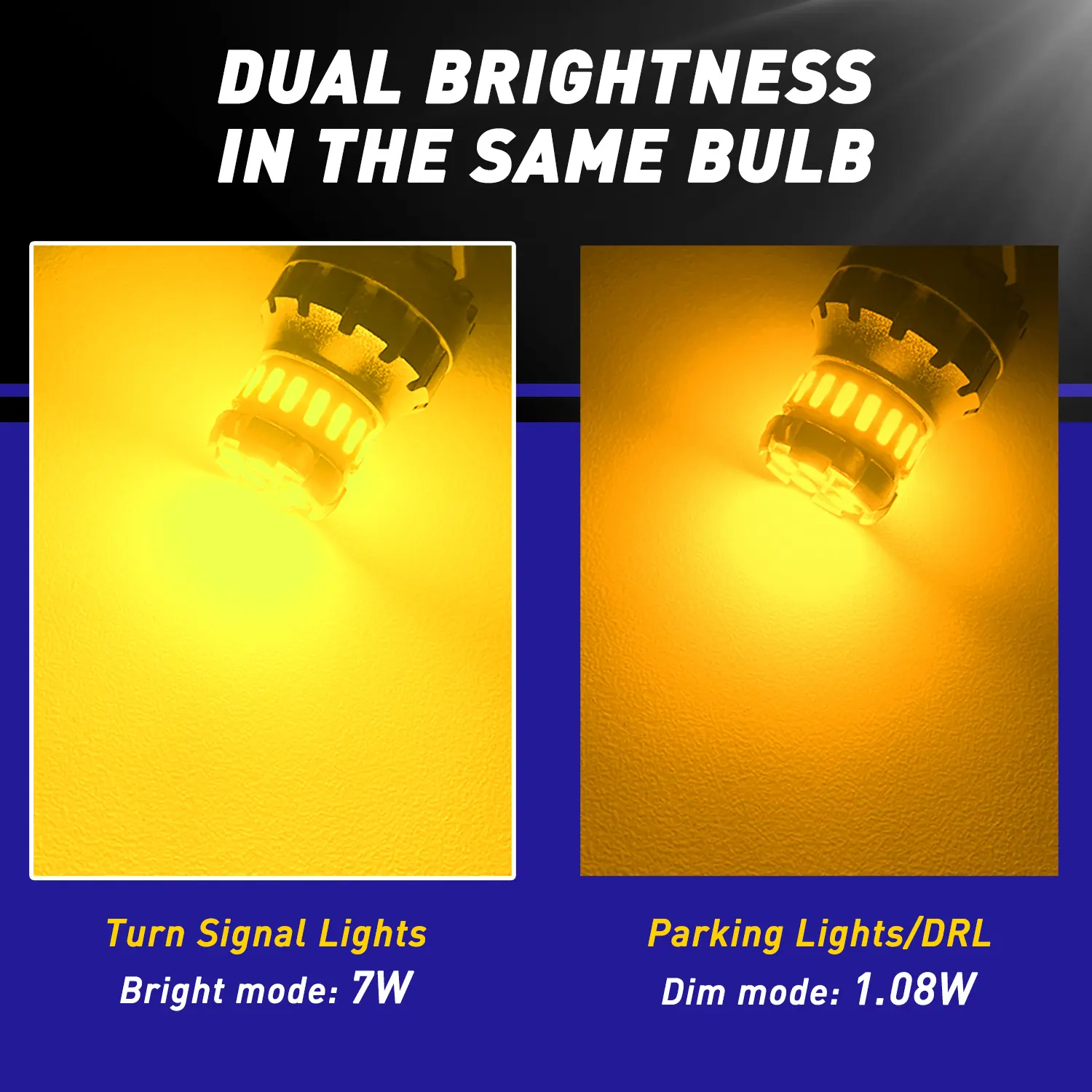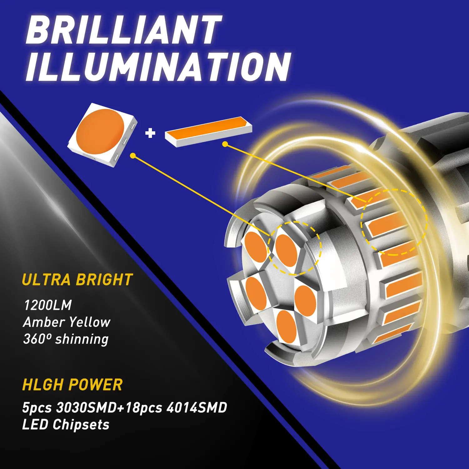 ·【Specifications】- 5pcs high power 3030 SMD chipsets, 18pcs 4014 SMD chipests; Power: 7.5W/ Bulbs; Voltage: 9~18V DC; Current: 0.62A; Lumen: 1400 LM/ Bulbs; IP67 Waterproof; Lifespan: 45,000+hours; Light Color: Amber Yellow