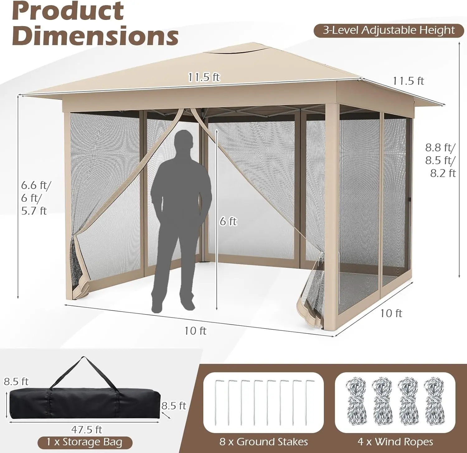 This is only 10x10 and drips rain from the seams at the top. Got it up easy yesterday with help, rained today, dripping inside. The rug I bought is 8x10 the tent is not 11x11 as advertised.