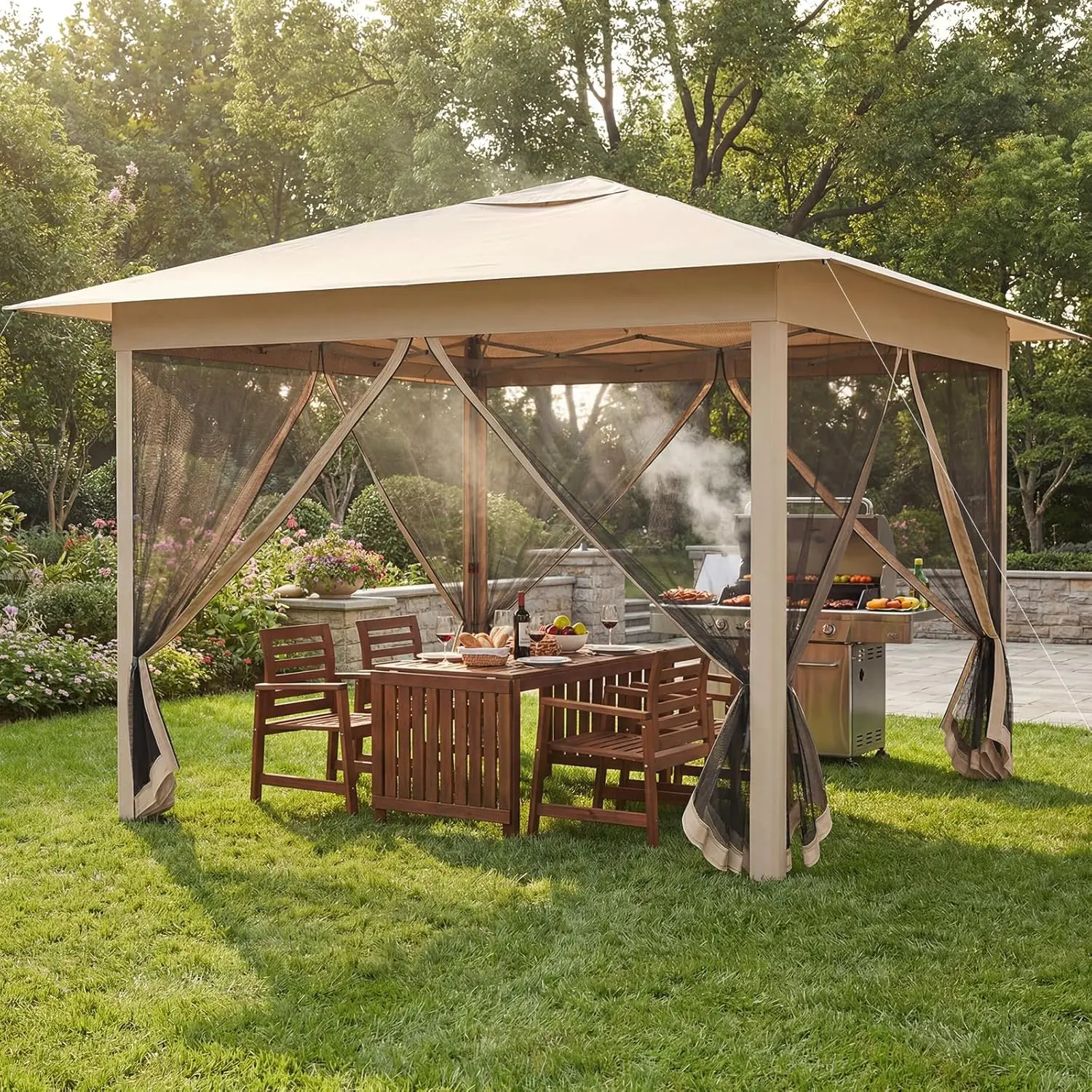 Awsome pop up, I got it for my mom, to replace her broken patio umbrella, it's durable and if anchored down properly it won't budge with the wind, i have mine semi permanently anchord on a back deck around a pool,its perfect not just for events, but everday use. im 100% happy, she loves it,