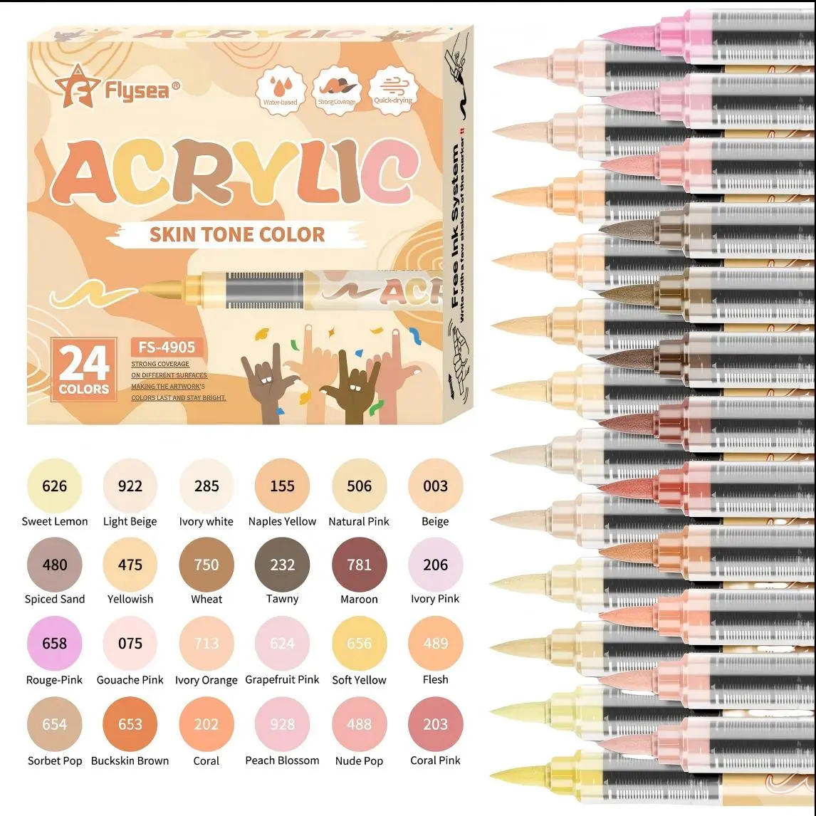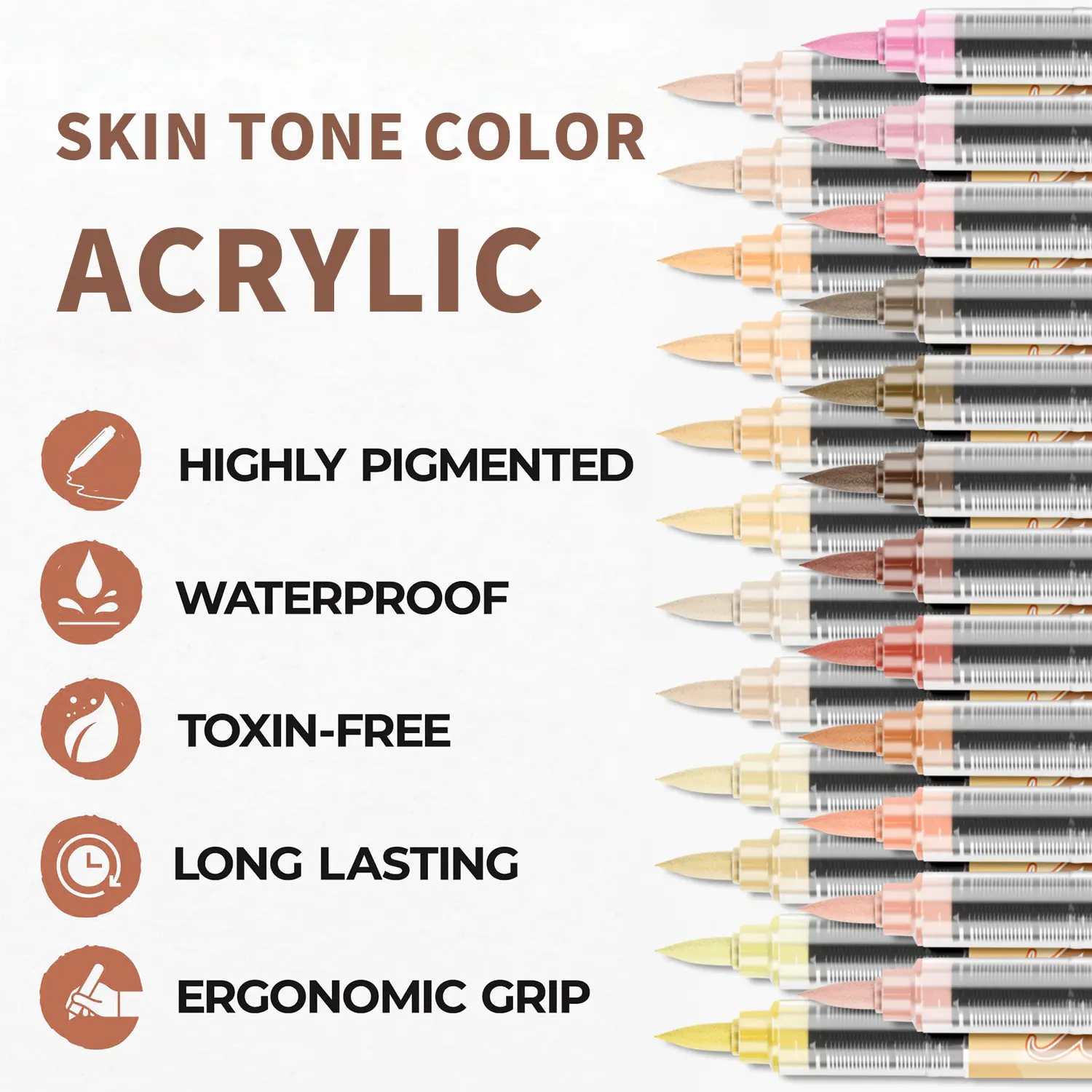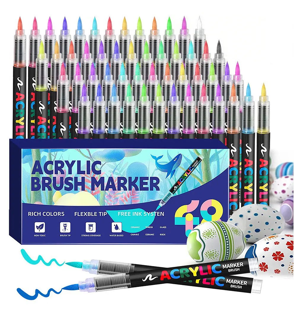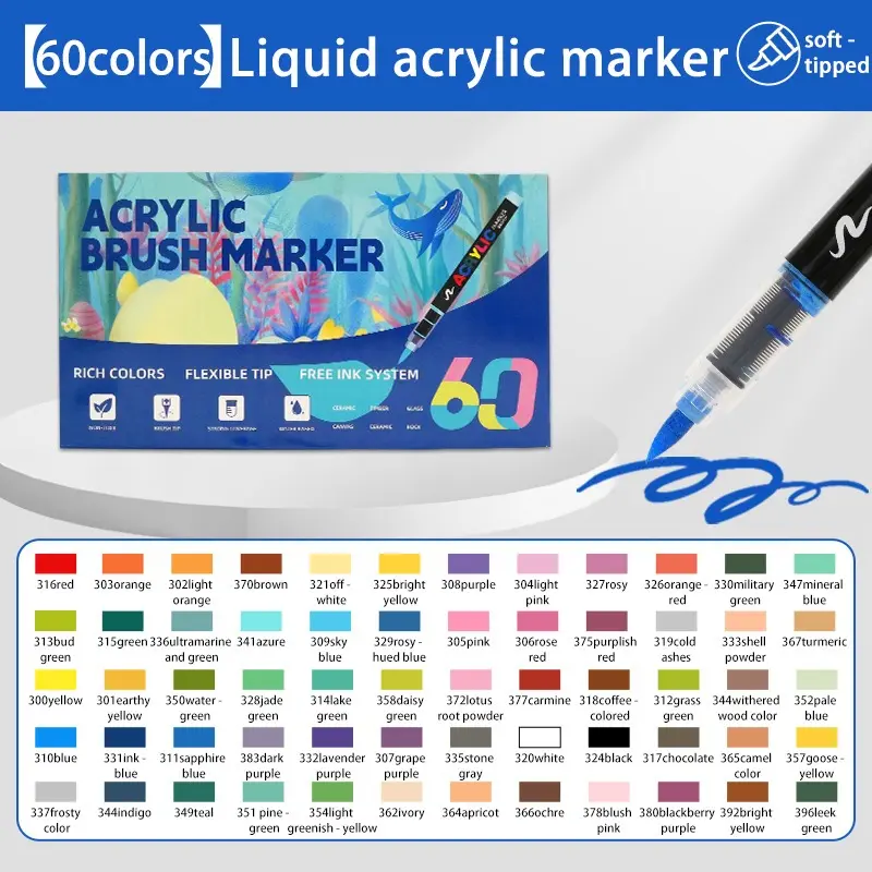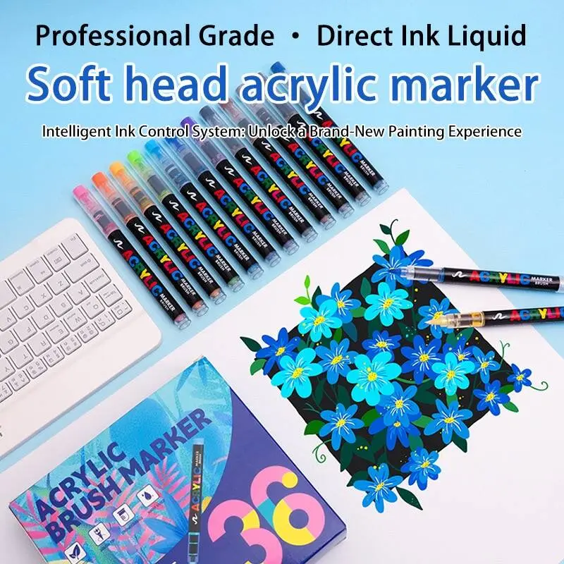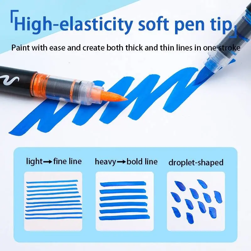 Self-contained acrylic brush pen eliminates messy palettes. Gravity-fed system ensures consistent flow. Flexible brush tip handles broad strokes and fine details—ideal for travel and sketching.