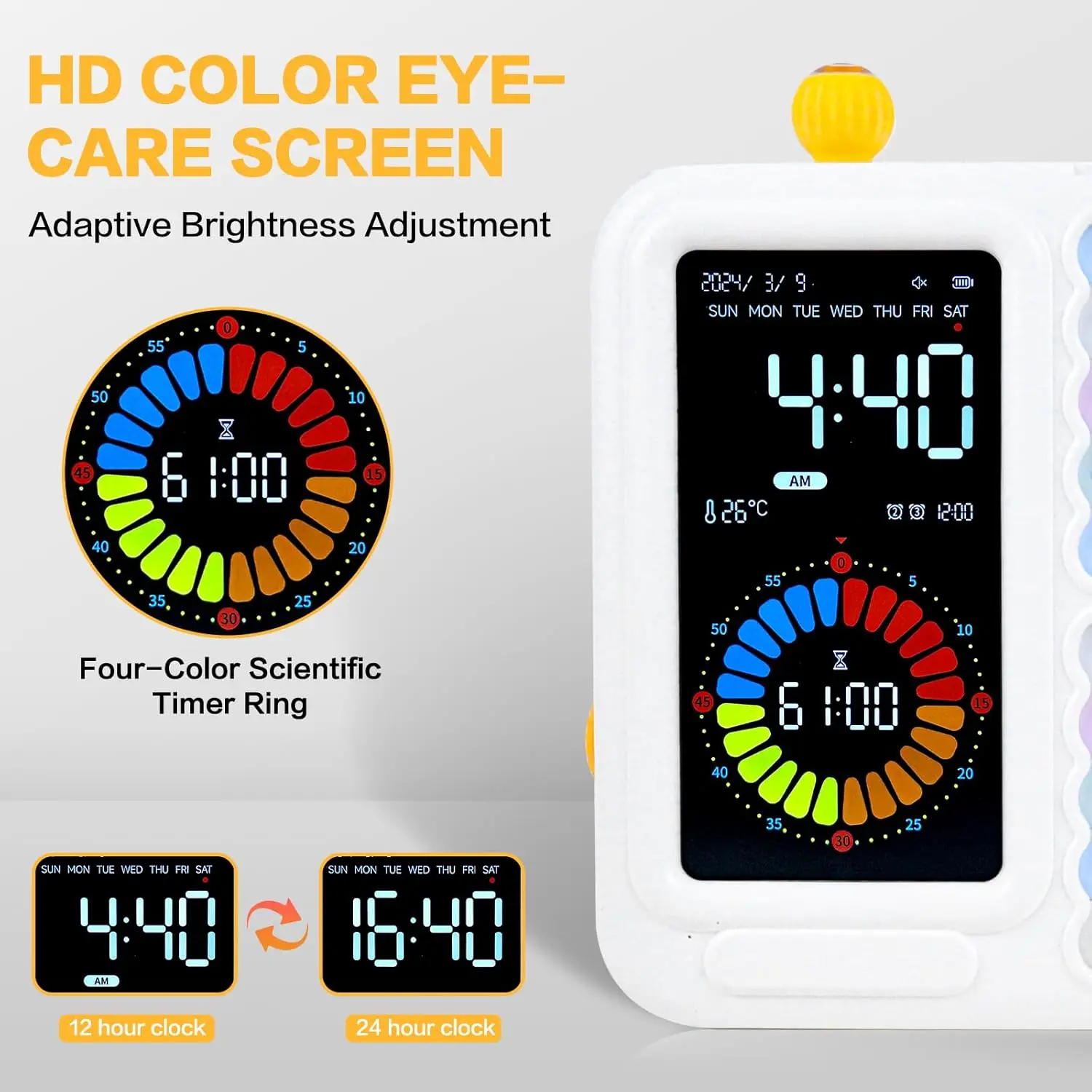 [Second Generation Upgrade] The second generation of visual time management features a larger color screen, which automatically adjusts the screen brightness to protect 's eyesight. Set 3 alarms, you can customize the reminders for various tasks. 12/24 hour system switching, lighted ringtones and many functions.
