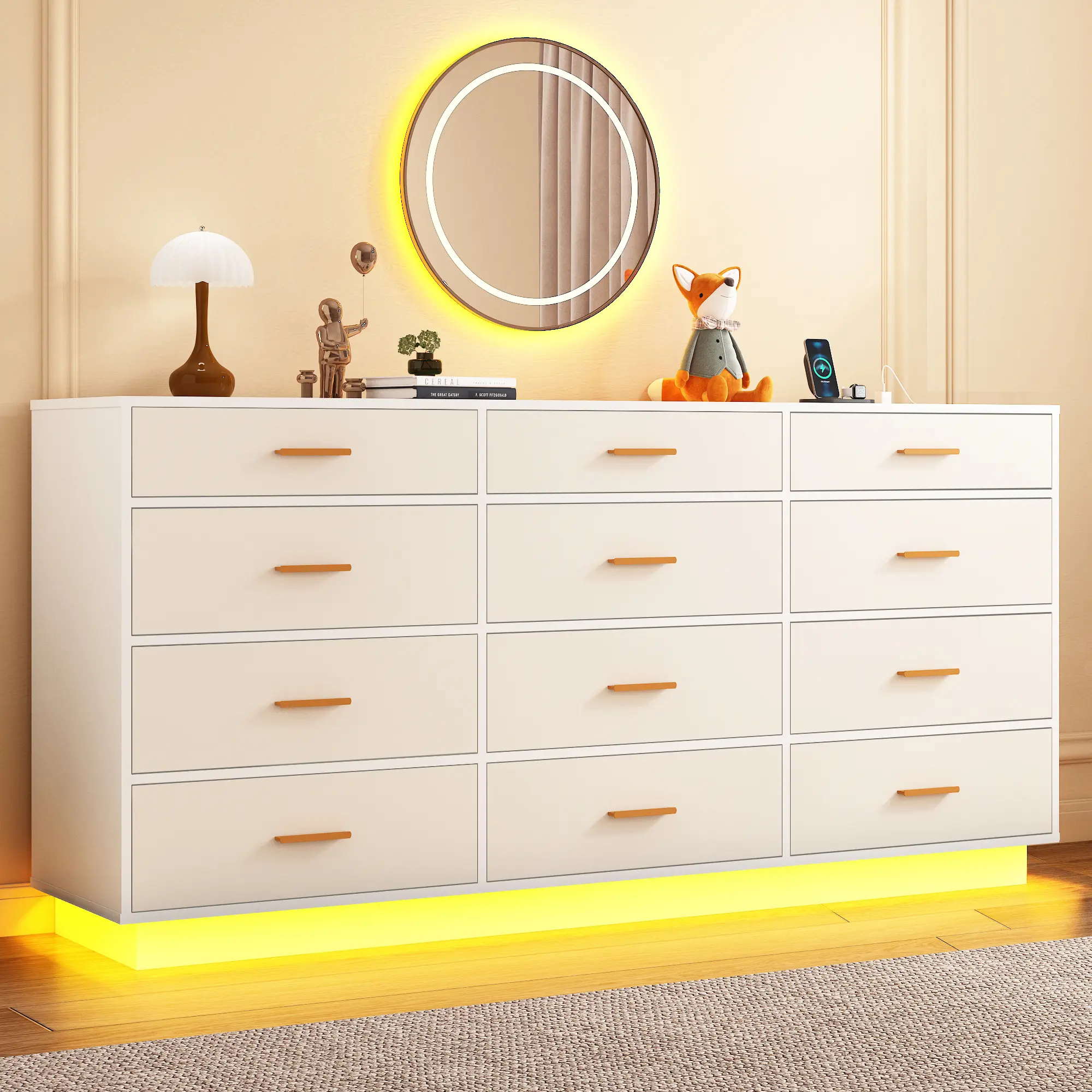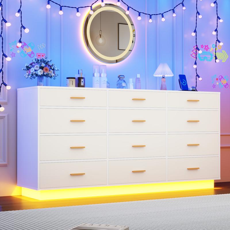 White/Black Dresser with Power Outlet ---- Unlike other large wood dressers, our 12 drawers dresser with fast charging station, including 2 sockets, 1 USB ports, and 1 Type-C ports, which can quickly provide power for your mobile phones, tablets and other electronic devices, which is very convenient for our life.