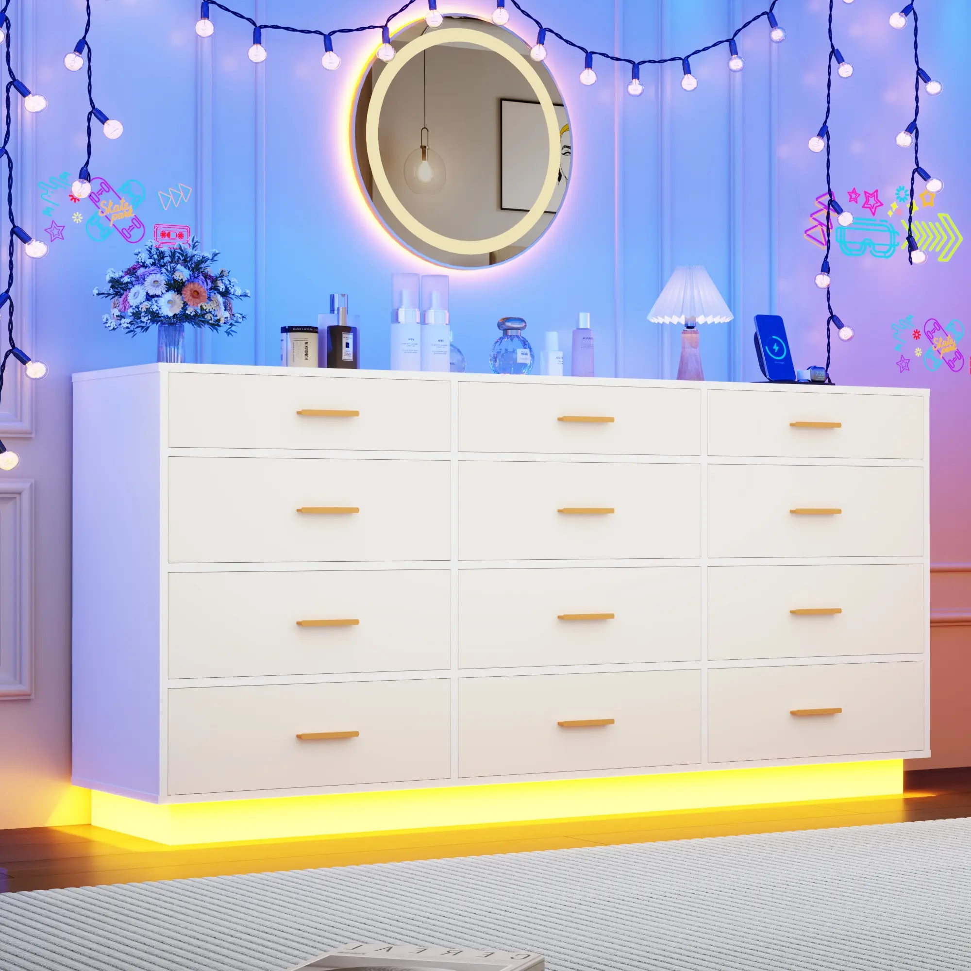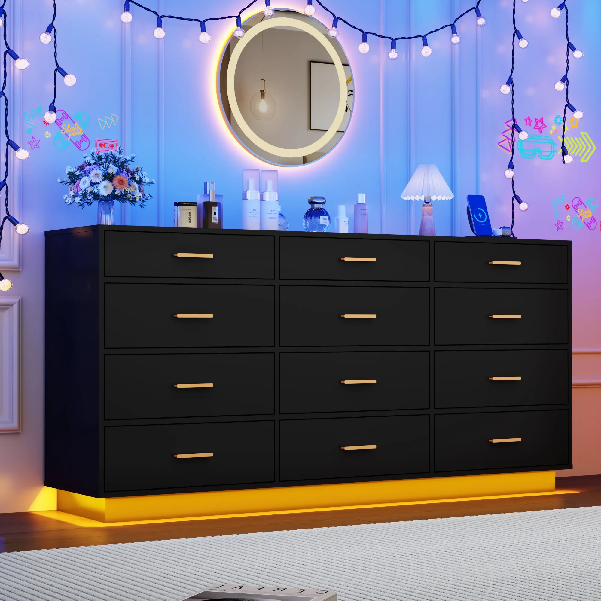 This wooden dresser features 12 drawers/9 Drawers with metal handles to store clothes, accessories, and other essentials. The dresser is made of high-quality wood, and each drawer has silent and rust-proof bottom rails, making this wooden cabinet waterproof, scratch-resistant, wear-resistant, and easy to push and pull. This 12 drawers/10 Drawers/9 Drawers Double Dresser comes with beautiful multicolor RGB LED light. You can control the light strip through the included remote or APP to freely change colors, adjust brightness, or customize modes. Light and bright, this dresser is inspired by chic designs. The perfect fusion of classic design and modern lifestyle.