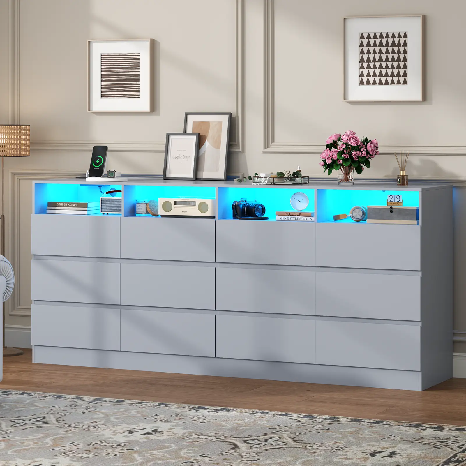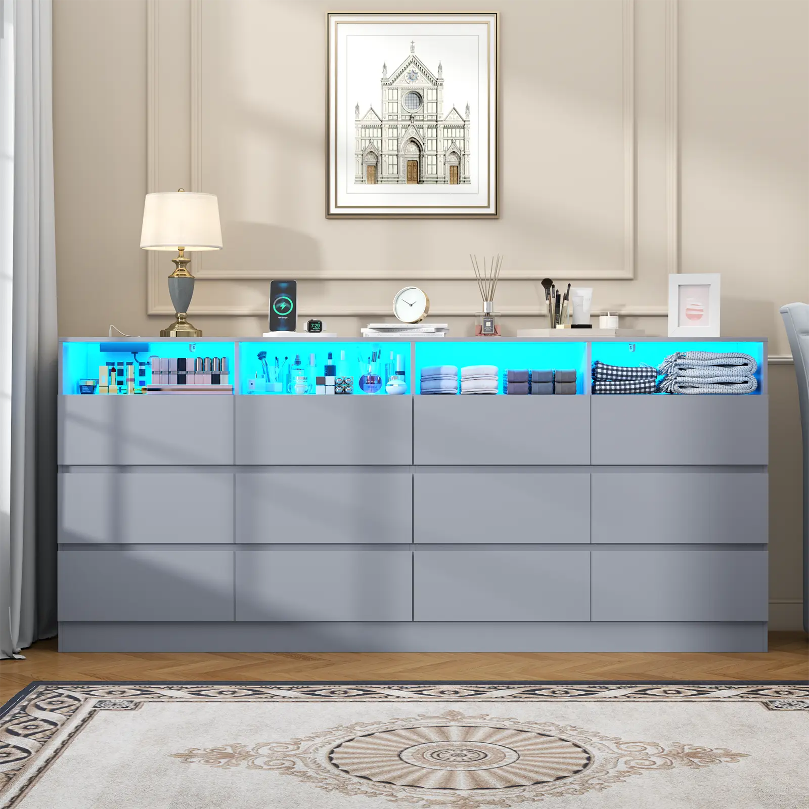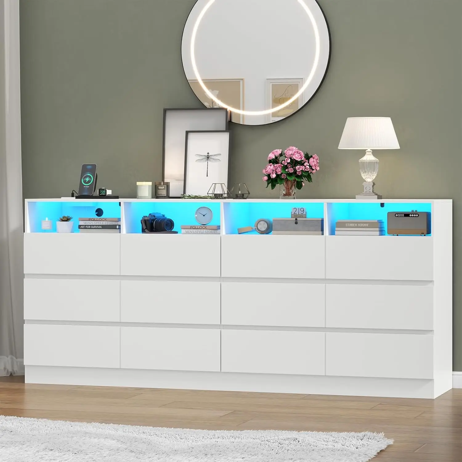 Modern 12 Drawer Dresser: With 12 generously sized drawers, this 63" Dresser helps you stay organized by providing ample space for your wardrobe, personal items, and even bedding. The smooth-glide drawers and open cubbies allow you to access your essentials with ease. Each divided drawer is designed to keep everything from bulky sweaters to delicate accessories neatly arranged. The spacious dresser top is ideal for accommodating a variety of items or doubling as a TV stand,perfect for TVs up to 75 inches. You can also use it to showcase or store frames, vases or other decor, adding both functionality and style to your space such as bedroom, closet, hallway, or living room.