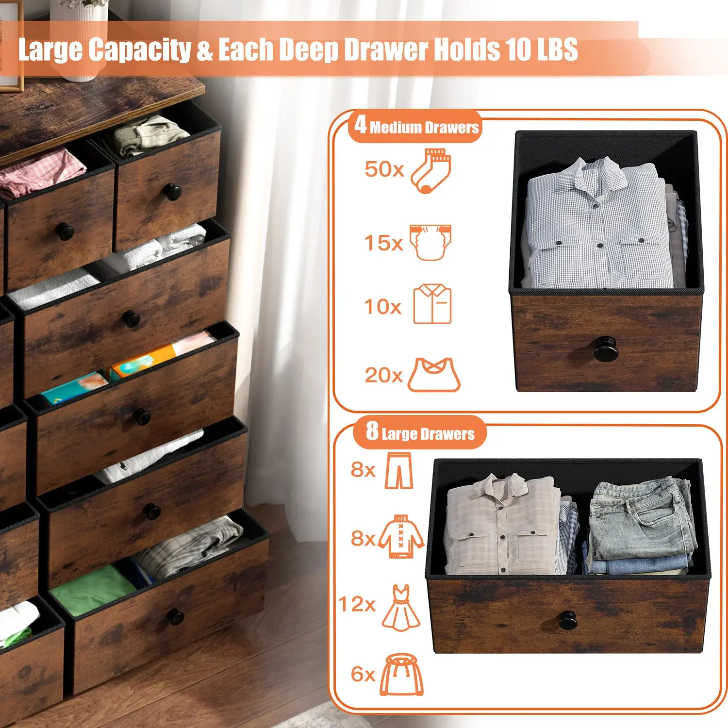 ·【Sufficient Storage Space】 The white dressers for bedroom has 4 medium and 8 spacious drawers, this white dresser for bedroom offers plenty and classified of storage for lingerie, blankets, underwear, clothes, and more. The wooden top provides a sturdy surface for a 50'' TV or displaying items such as vases, lamps, and books.