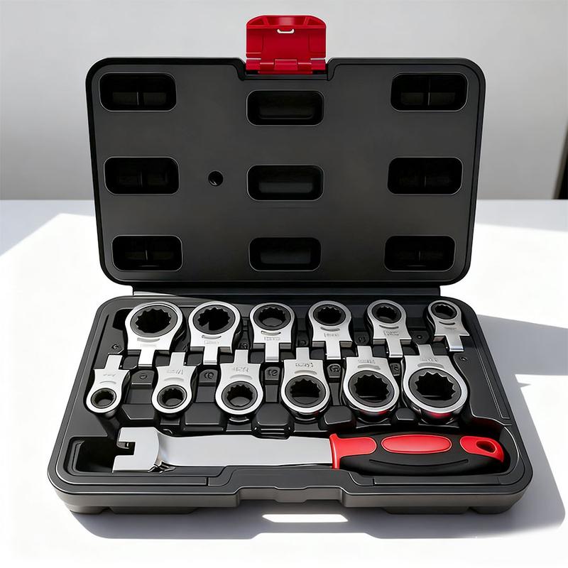 This ratchet wrench set includes 12 precision metric combination heads (8mm, 9mm, 10mm, 11mm, 12mm, 13mm, 14mm, 15mm, 16mm, 17mm, 18mm, 19mm). It provides a comprehensive range of sizes for car repairs, household projects, and construction work. The set is ideal for mechanics seeking a versatile tool for various tasks.