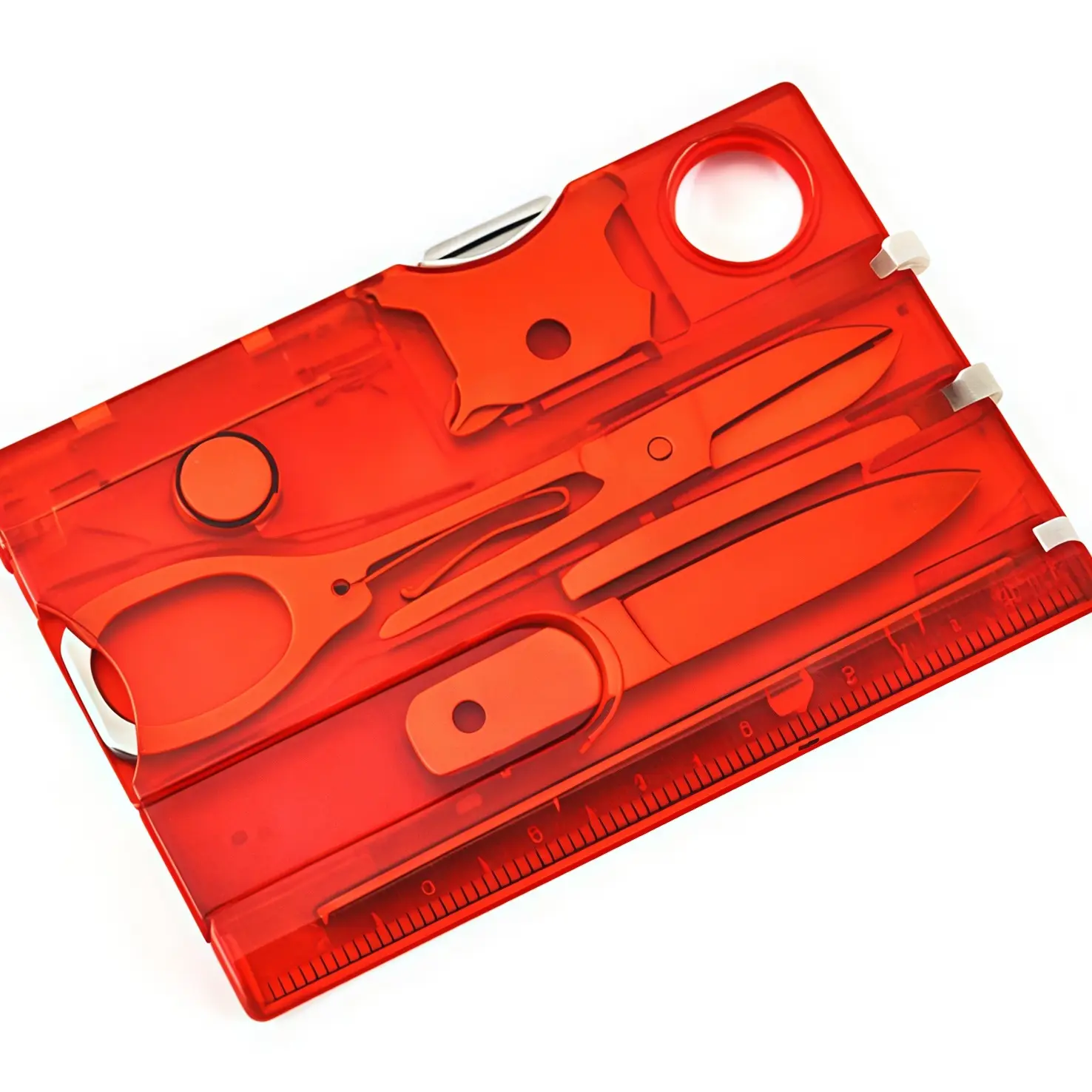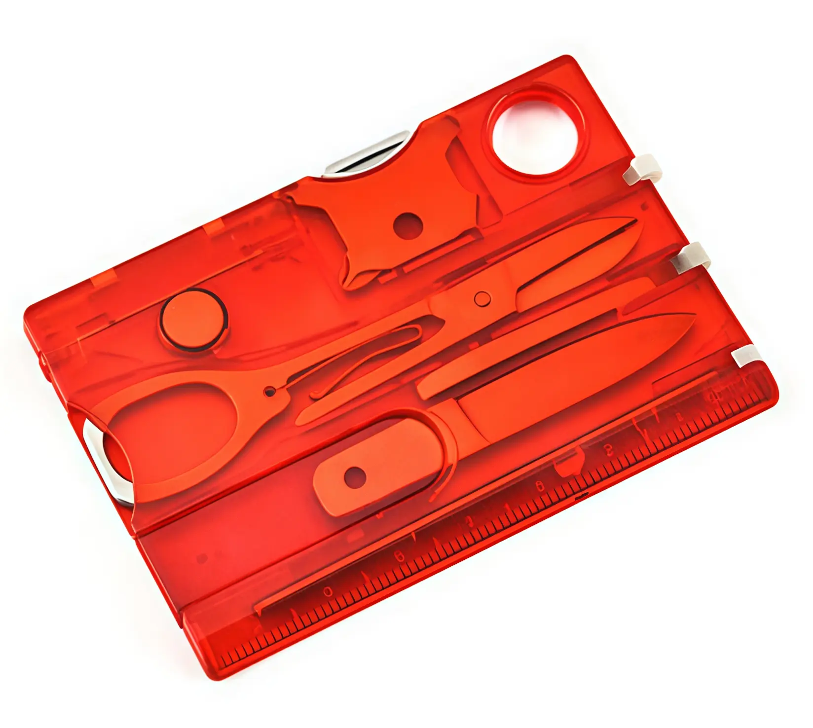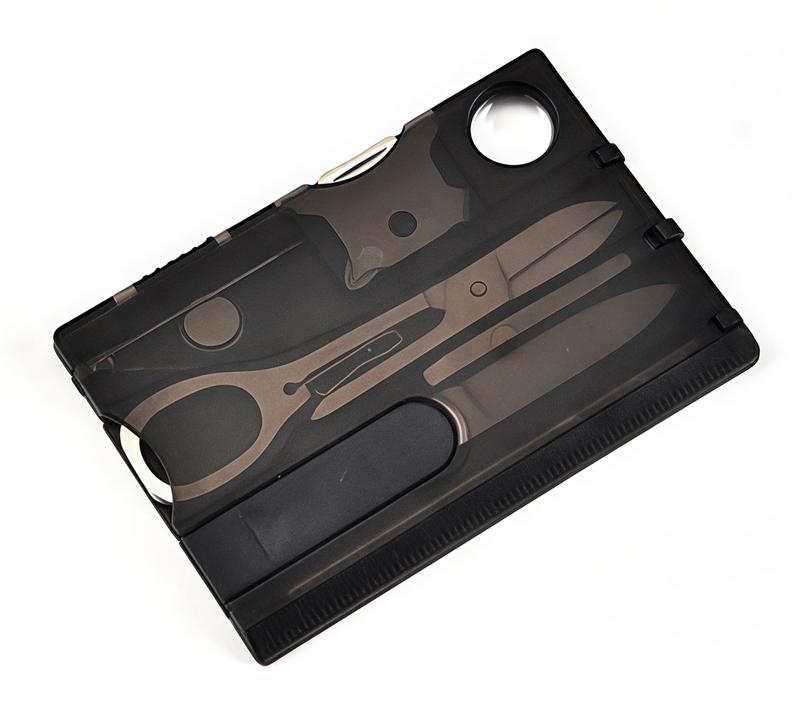 Credit card sized multitool featuring 12 essential tools including bottle opener, screwdriver, can opener, and ruler for everyday carry convenience