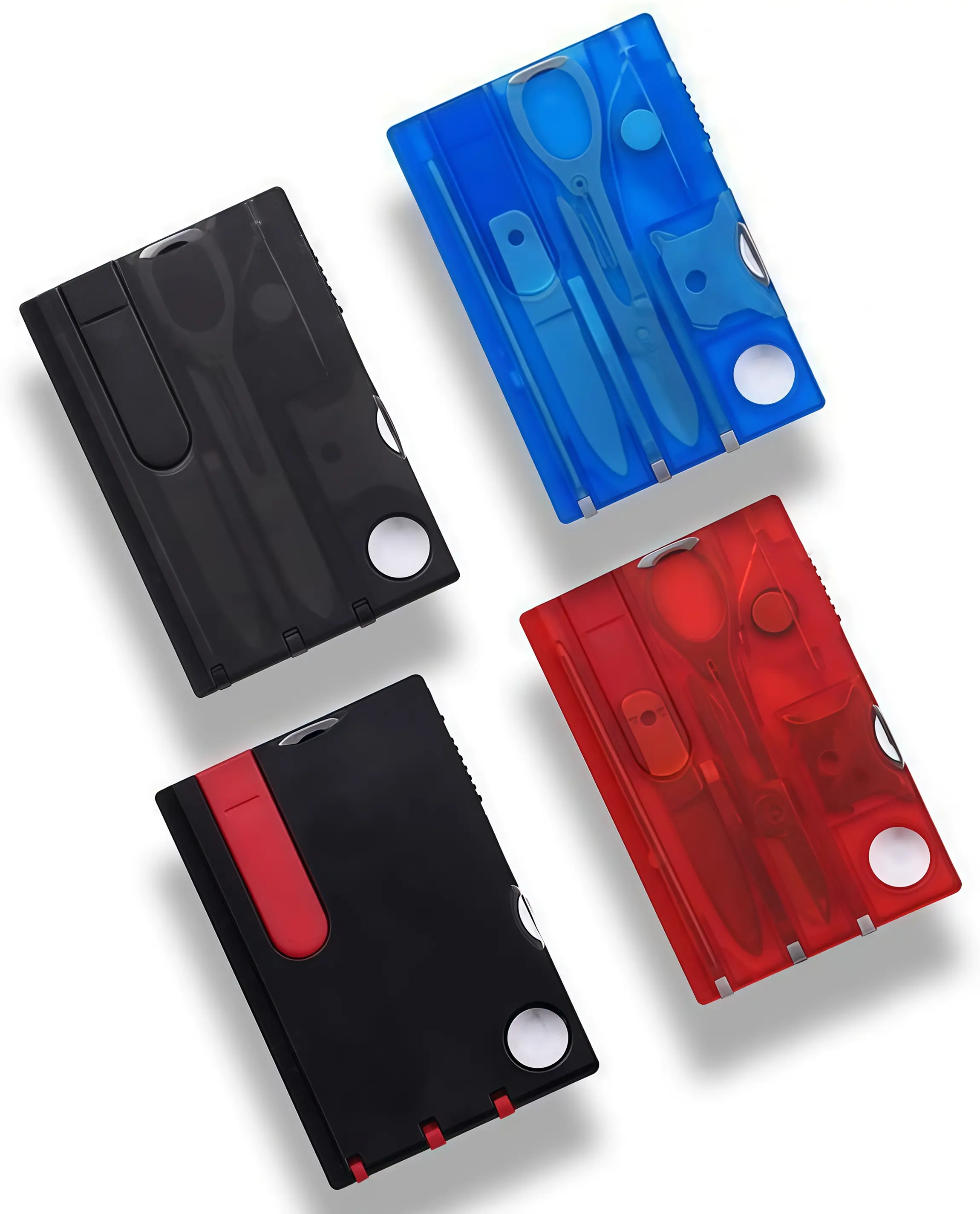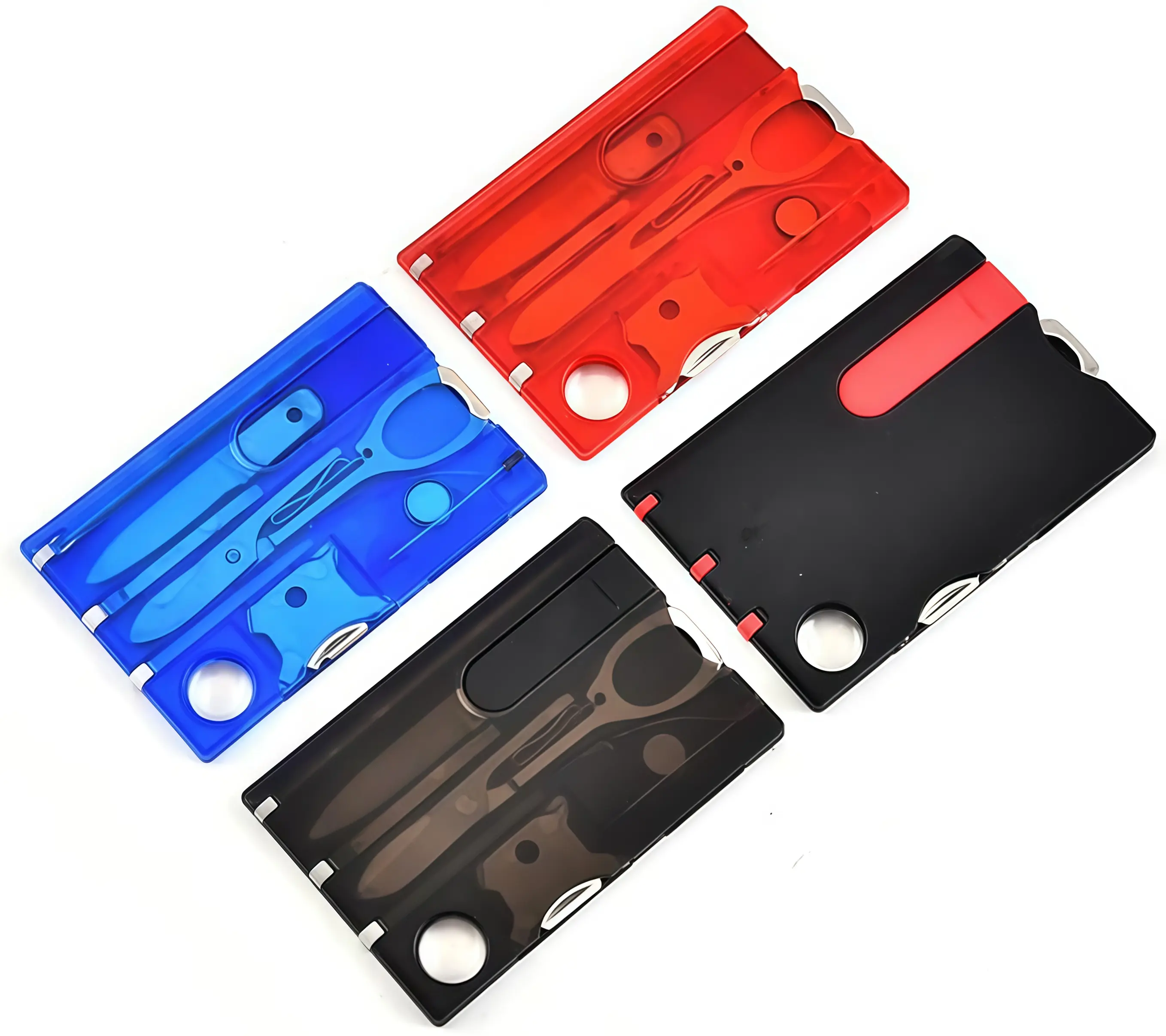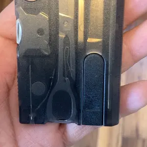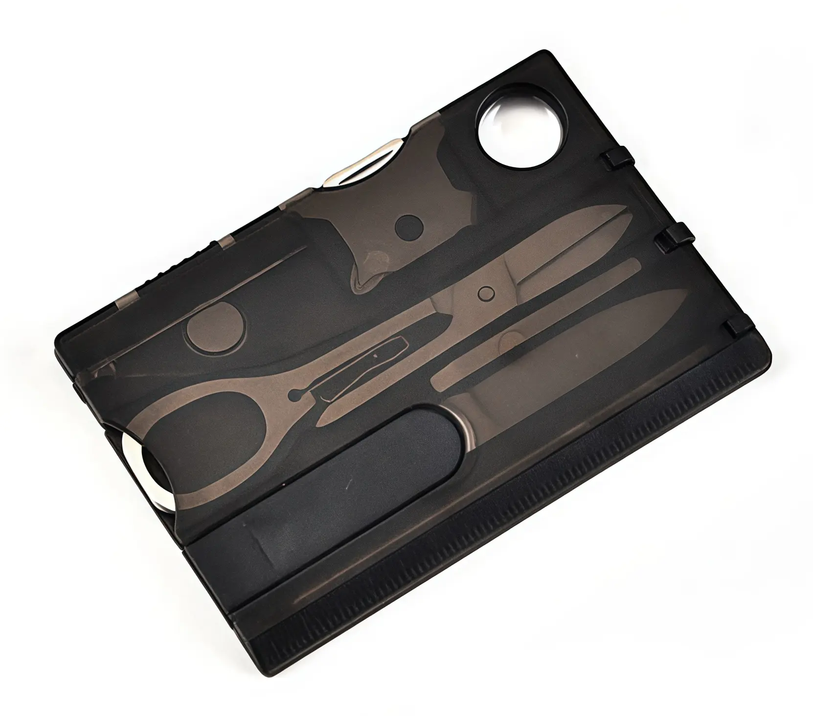 Credit card sized multitool featuring 12 essential tools including bottle opener, screwdriver, can opener, and ruler for everyday carry convenience