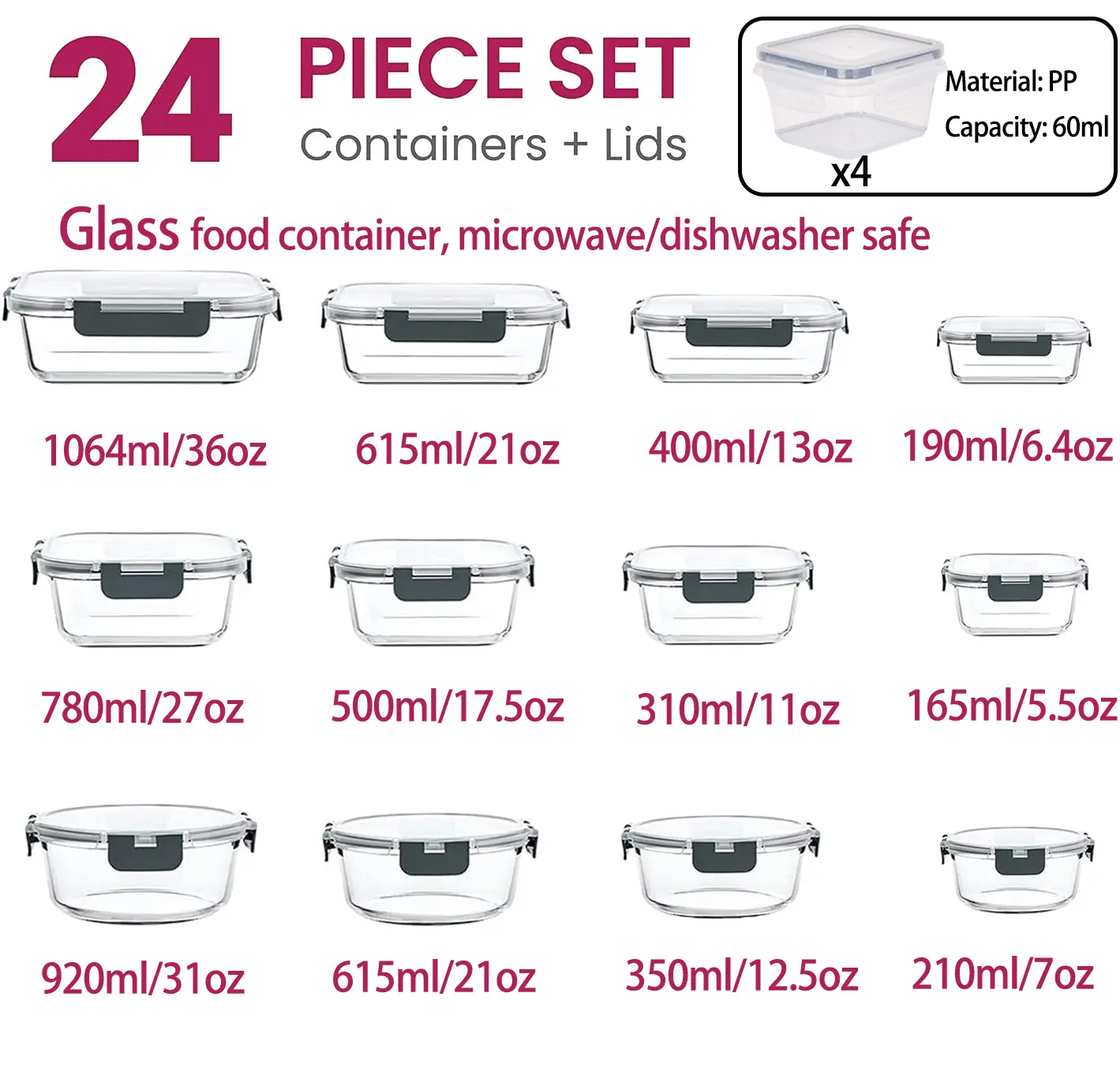 12Pack Airtight Glass Food Storage Containers with LidsThis Airtight Glass Food Storage Container set is a versatile addition to your kitchen. It offers convenience and peace of mind when storing food. The airtight seal ensures freshness and prevents leaks. Perfect for various uses, it's microwave, oven, refrigerator, and dishwasher safe. ️Safe and VersatileThe set includes multiple containers of different sizes to suit your storage needs. The leak-proof locking lid provides added security during transportation or storage. BPA-free, these glass lunch boxes keep your food fresh. ️Key Features·Airtight Seal: Ensures freshness and prevents leaks.·Safe for Various Uses: Microwave, oven, refrigerator, and dishwasher safe.·BPA-Free: Ensures safety for your food.·Multiple Sizes: Includes containers to suit different needs. ️