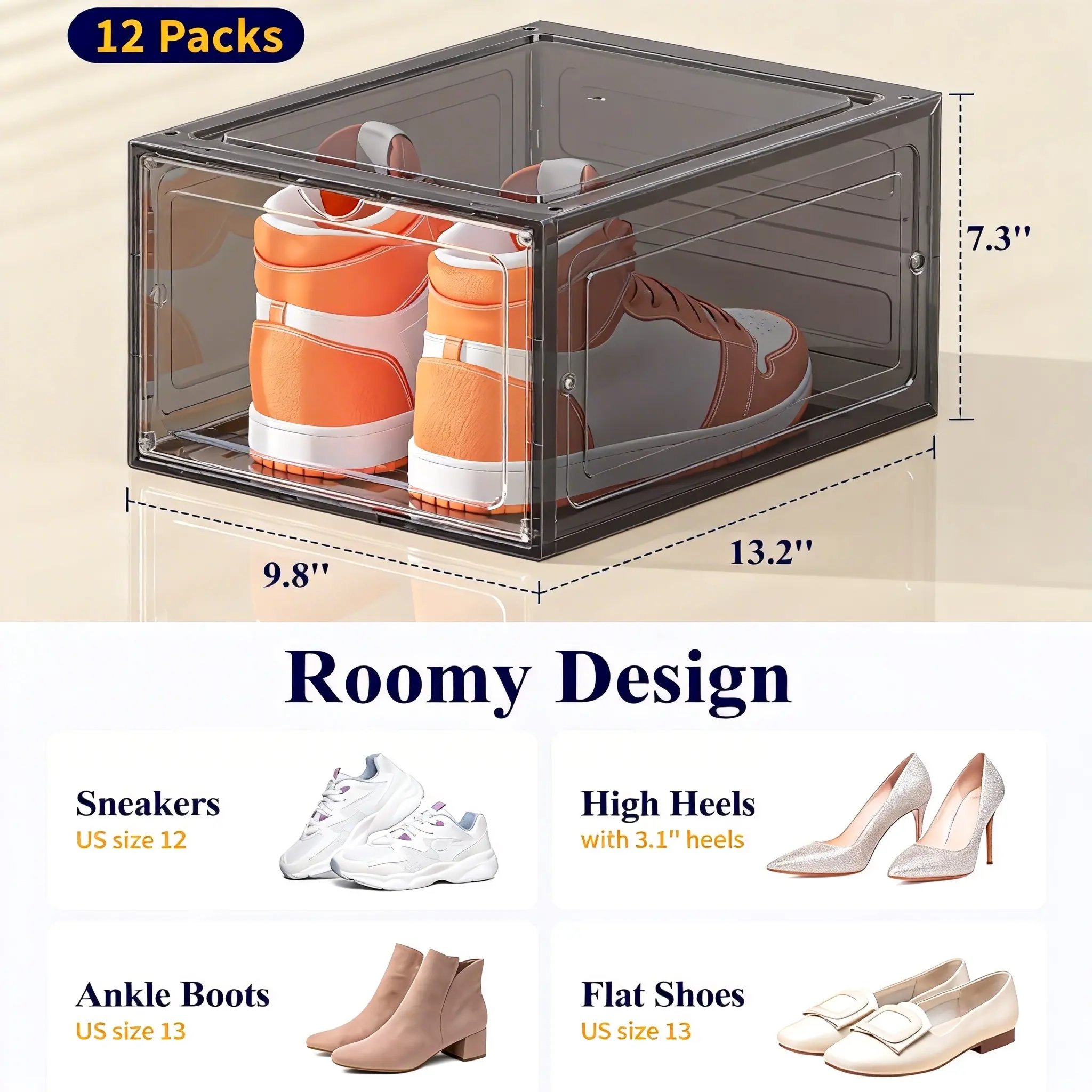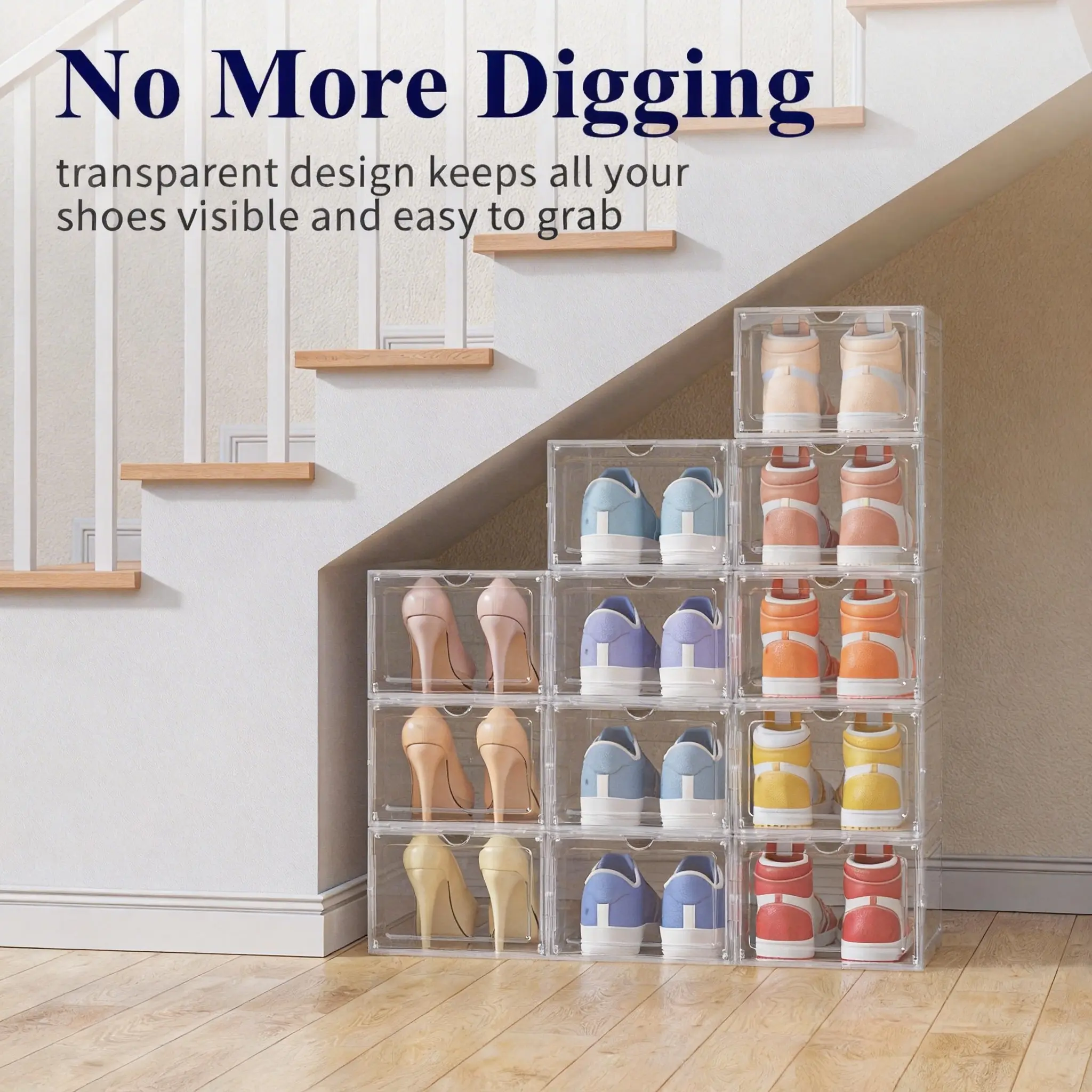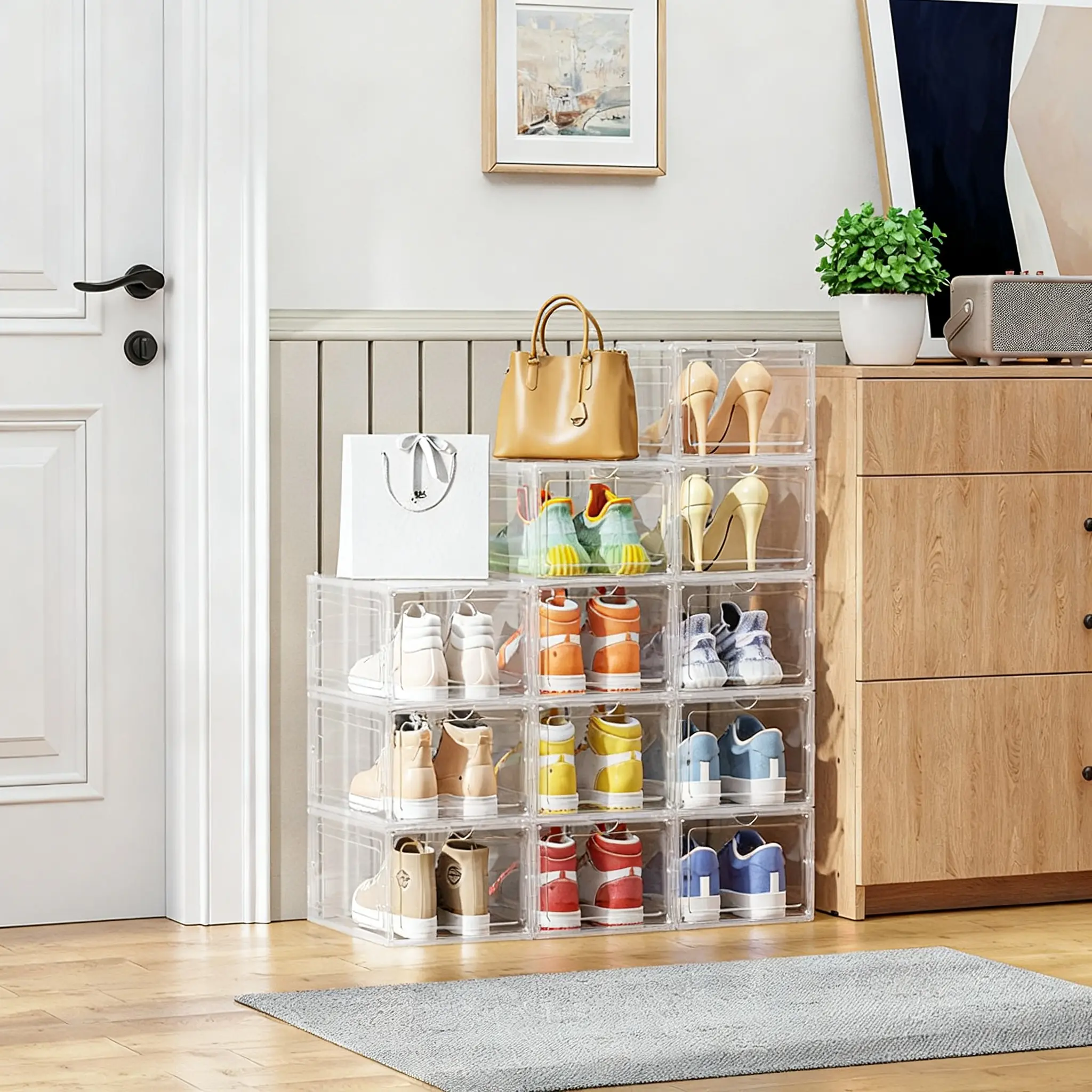 12 Pack Clear Black Shoe Storage Boxes, Stackable Plastic Shoe Organizer with Drop Front Door, Transparent Sneaker Storage Cases for Closet, Space Saving Shoe Containers for Men and Women, Foldable Shoe Box Organizer for Home