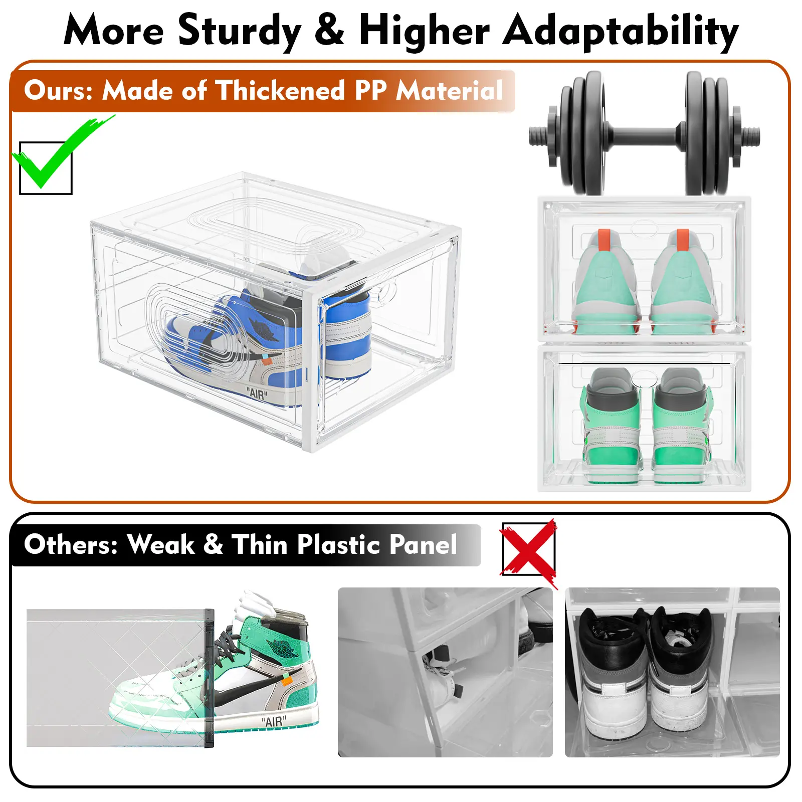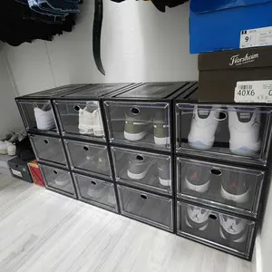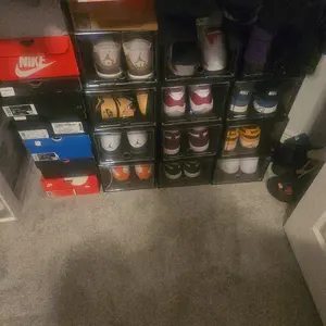 These shoe boxes have redesigned my closet. I have much more space. I can see my footwear, making decisions easier when getting ready. They’re sturdy & very easy to put together. The stackable feature keeps everything together. I originally ordered 40 but just ordered 20more!
