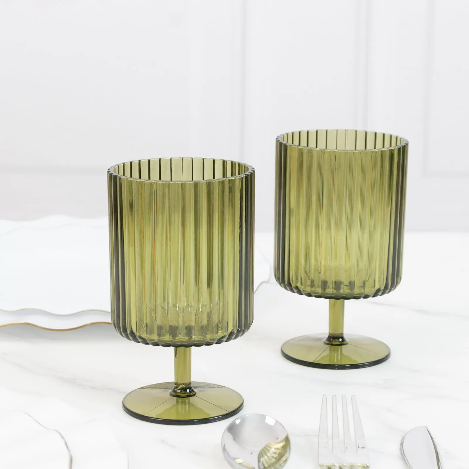 12-Pack Plastic Goblets Dusty Sage Green Vintage Ribbed Pattern Short Stem - Reusable Wine Glasses 12oz