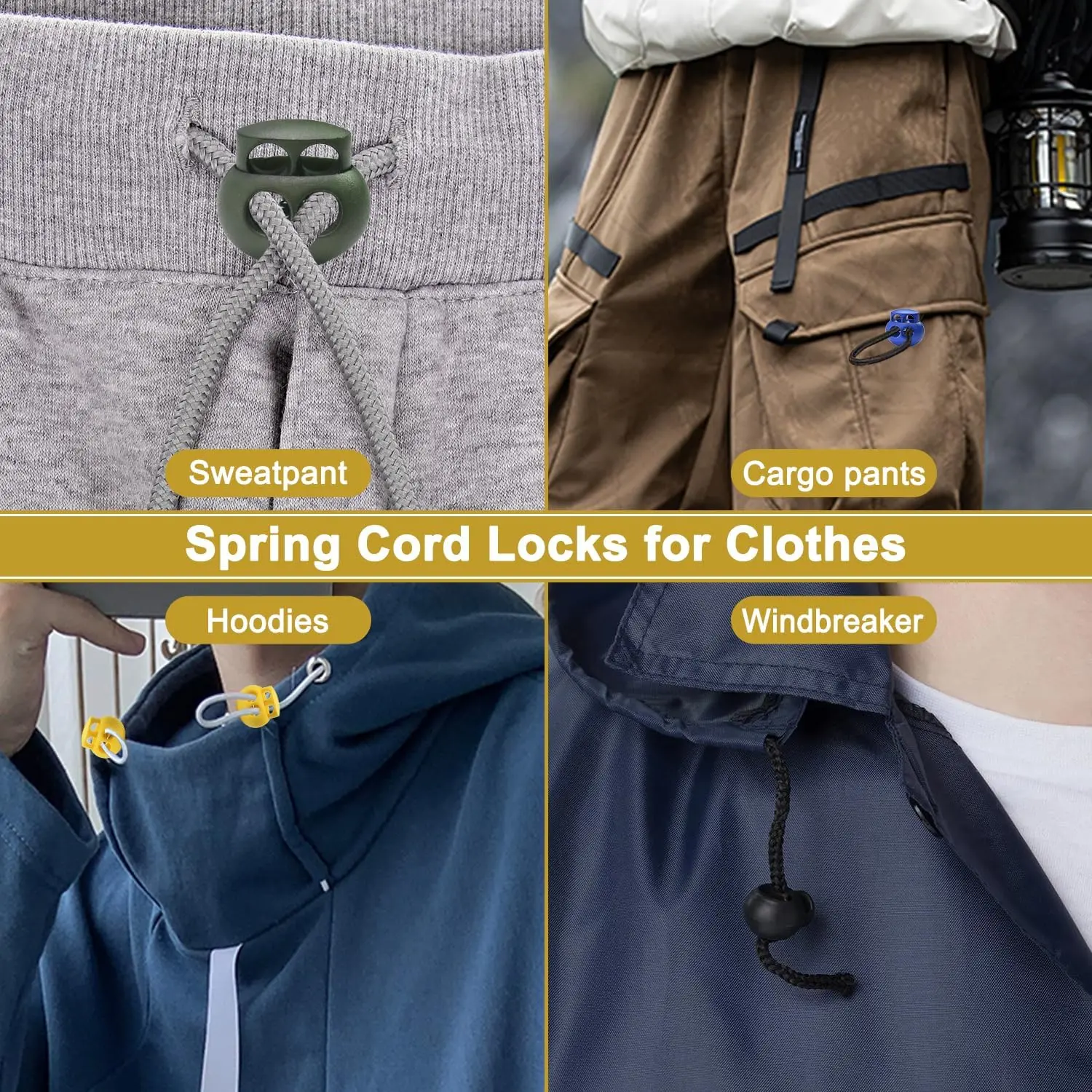 Multipurpose: Paracord spring cord Locks are fit a variety of different drawstrings and types of cords, so that your ropes are no longer loose and knotted, keeping them neat and tidy, use for no tie shoelaces lock, backPack drawstrings clip, drawstring bag, pants, lanyard, luggage, clothing,hoodies, hats, glove lock, flashlight, sportwear, tent, paracord products and a variety of outdoor and gym products DIY replacement