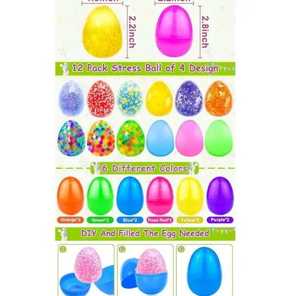 ✨ 12 Pack Prefilled Easter Eggs with toys and stress relief fidget balls. These Easter egg fillers are ideal for kids' classroom party favors and gifts. Each egg is pre-filled, making it convenient for easy distribution. Perfect for adding a fun twist to your Easter basket.