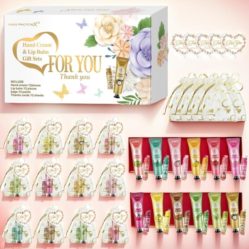 Valentine's Day Variety Gift Set Hand Cream and Lip Balm, Includes 12 Hand Creams, 12 Lip Balms, 12 Heart Bags, Perfect for All Skin Types