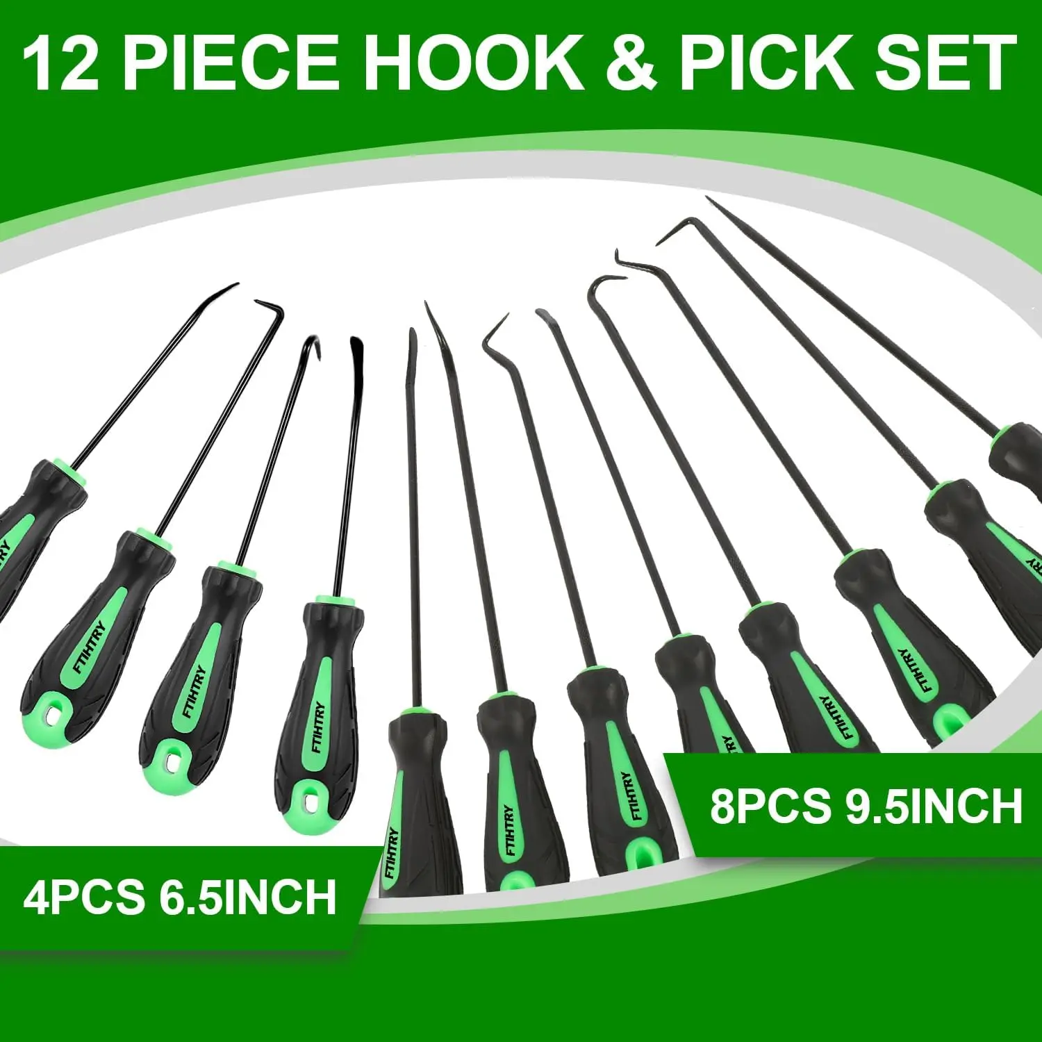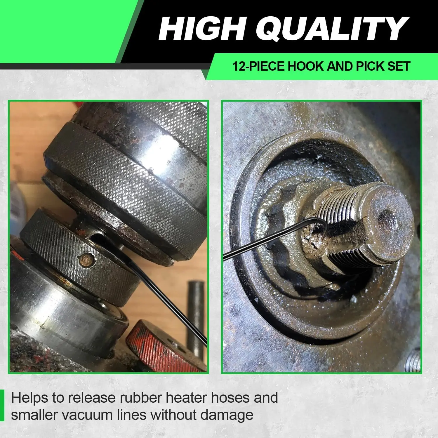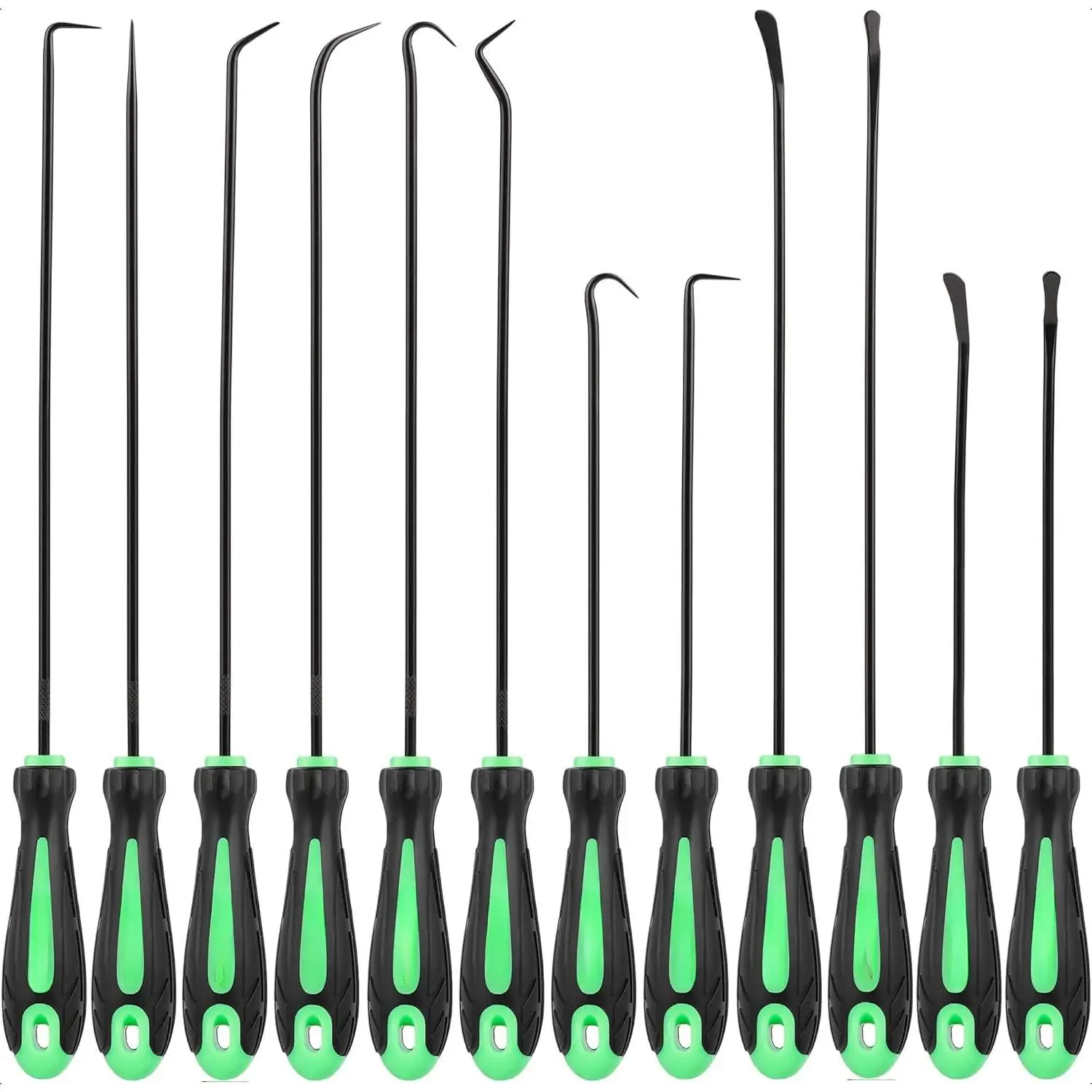 Premium Quality - Made of heat treated CR-V steel and chrome vanadium steel shafts, sturdy and sharp.Ergonomic Grip - Non-slip rubber handle assuring precision control, help with precise work like jewelry hand making.Multi-Use - Heavy Duty Hook Set has 6 shapes for pulling clips rings wires gaskets washers and other small parts and 4pcs o-ring pick set ,the rounded tips with blended edges come in handy for easy removal of seals and O-rings.Includes 12pcs - hook, 90-degree hook, 45-degree hook, double angle hook, complex hook, angle hook .4pcs o-ring pick set.Application-This pick and hook kit is used for ignition system, intake valve,seals, rifle bolt surface, fuel valve O-ring, hose end O-ring and more electronic