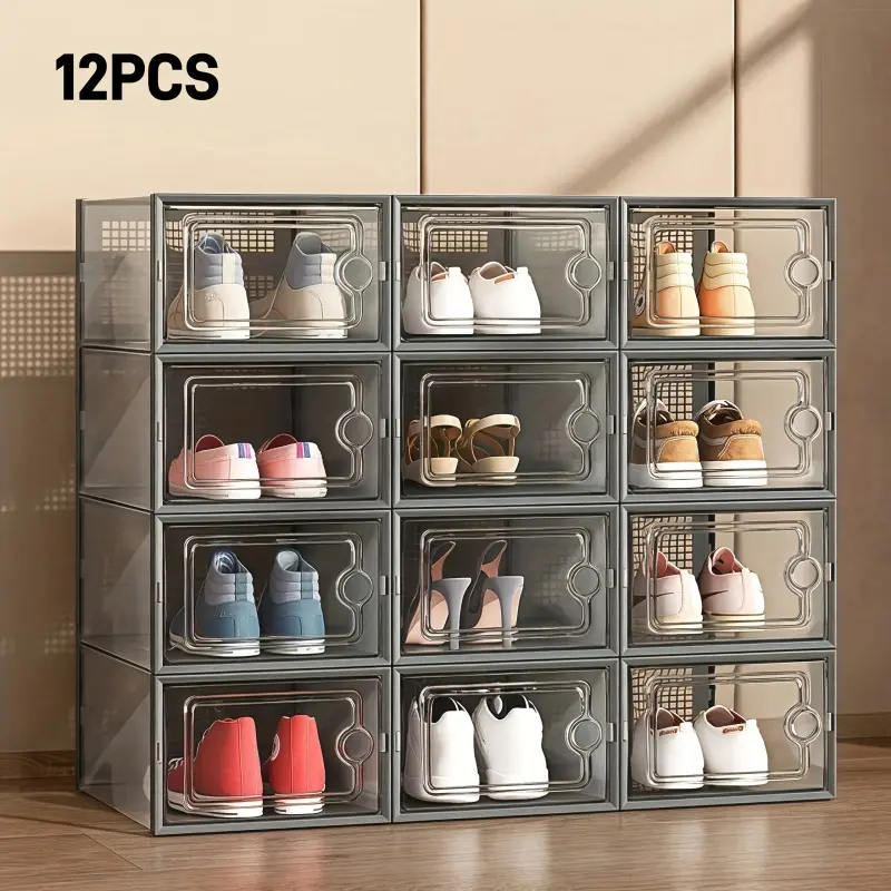 12 Pcs Thickened Clear Shoe Box with Cover, Foldable Shoe Rack Stackable Shoe Rack, Free Combination, Plastic Sneaker Container, Space-Saving Storage Organizer
