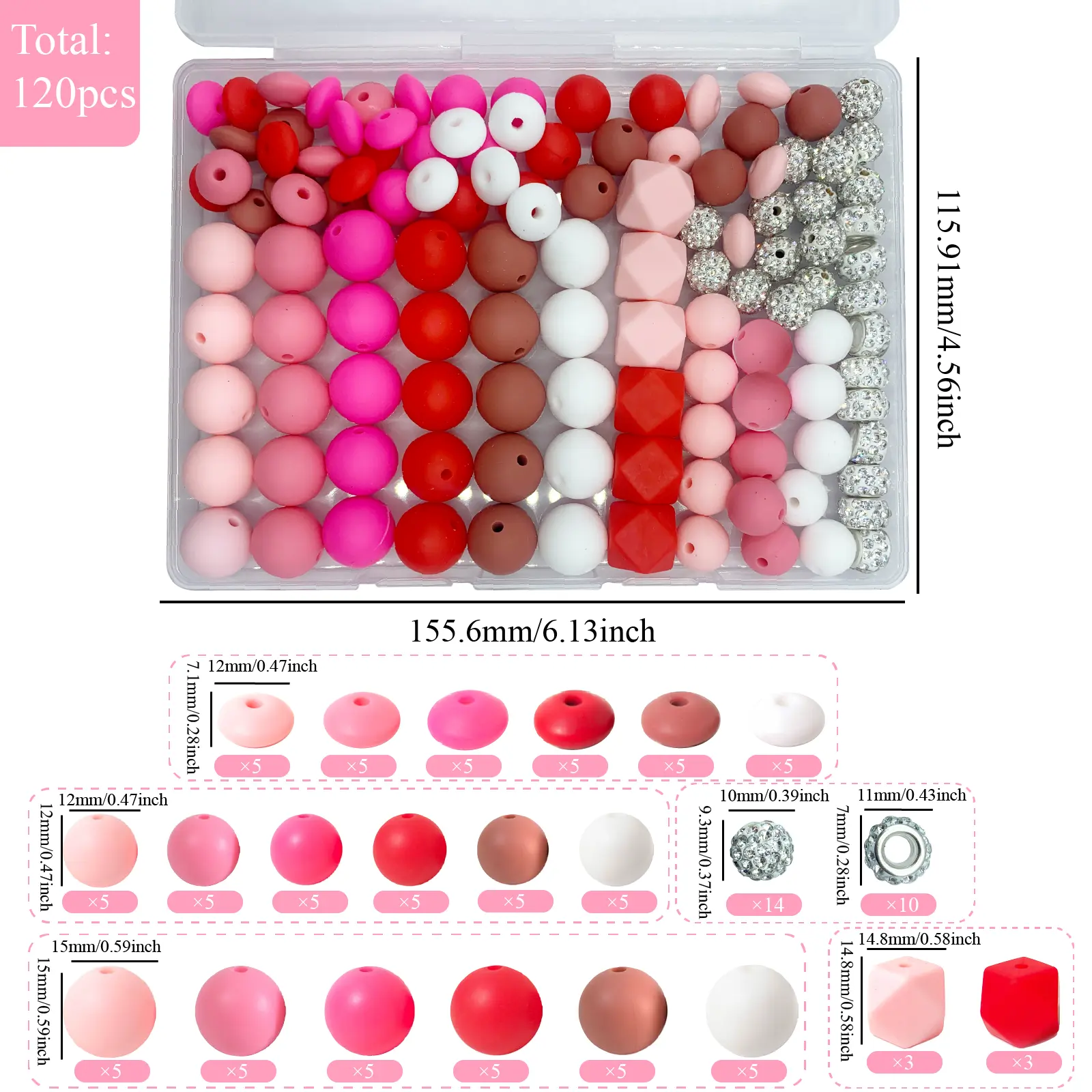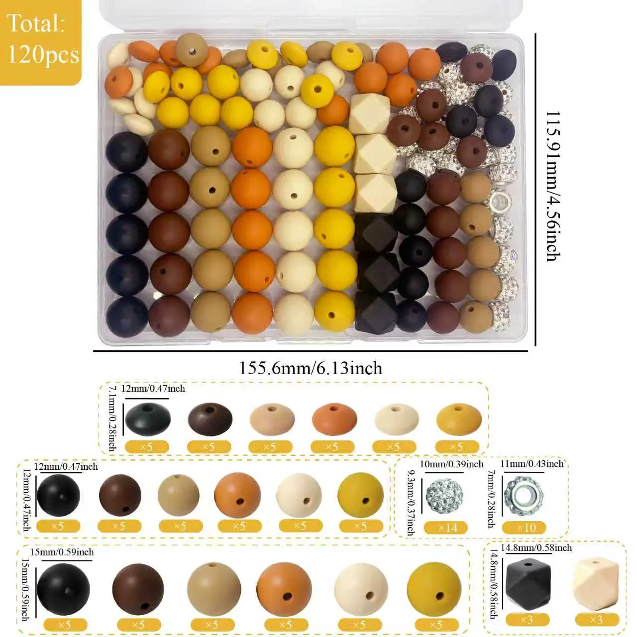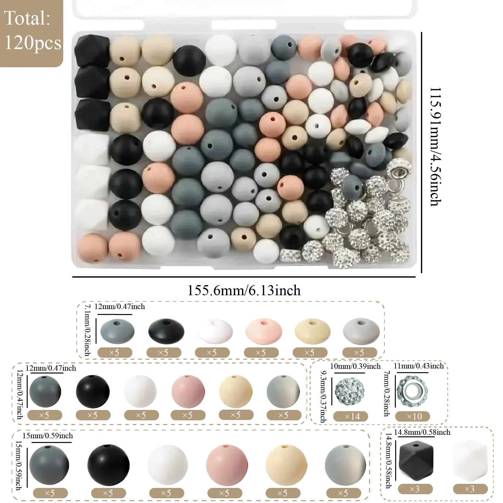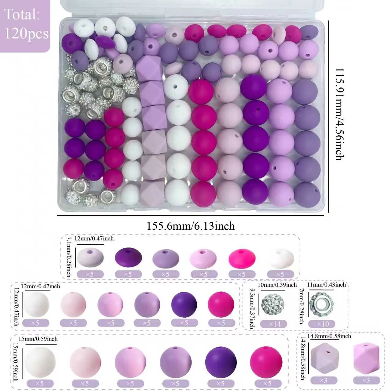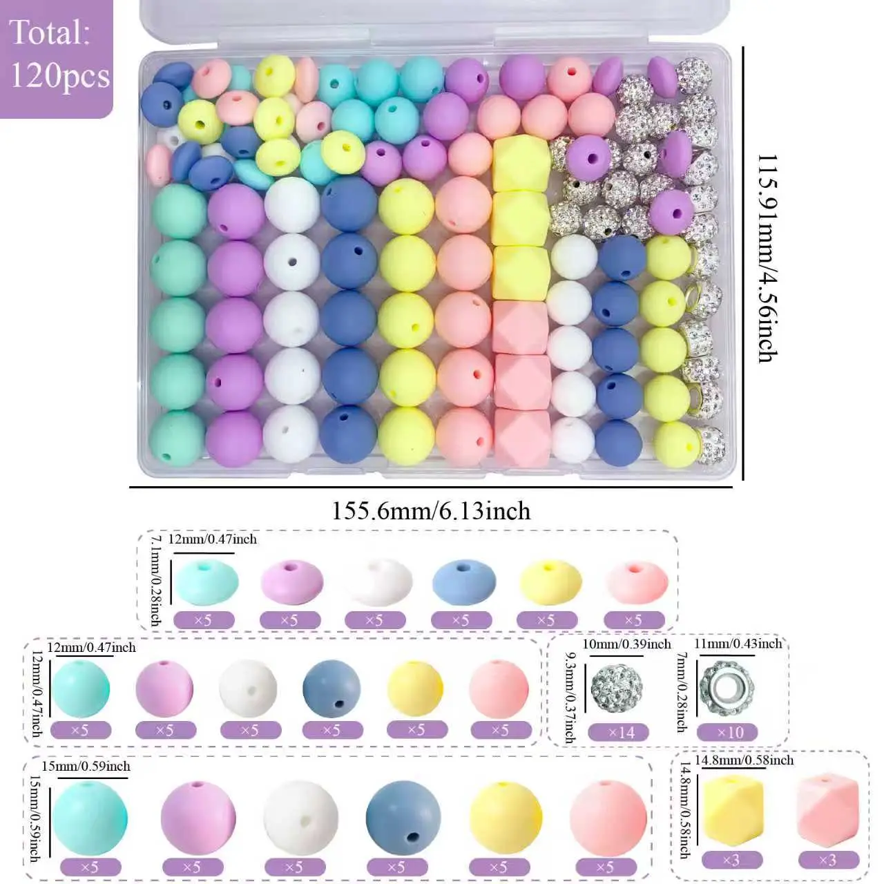 Bead Classification Details: You will receive this 120-piece silicone bead set, including 30 round silicone beads (15mm), 30 round silicone beads (12mm), 30 kidney-shaped silicone beads (12mm), 6 hexagonal silicone beads (14mm), 14 crystal beads (10mm), and 10 spacer beads (10mm crystal).