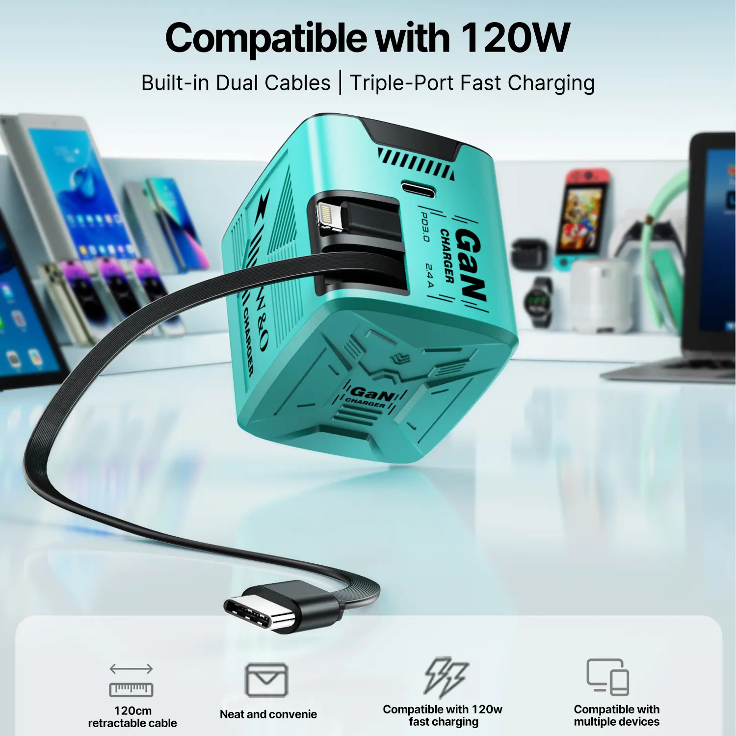 Compatible with 120W 3-in-1 Retractable GAN Fast Charger #ganfastcharger #phonecharger #fastcharger #3in1fastcharger #tiktokshopcreatorpicks