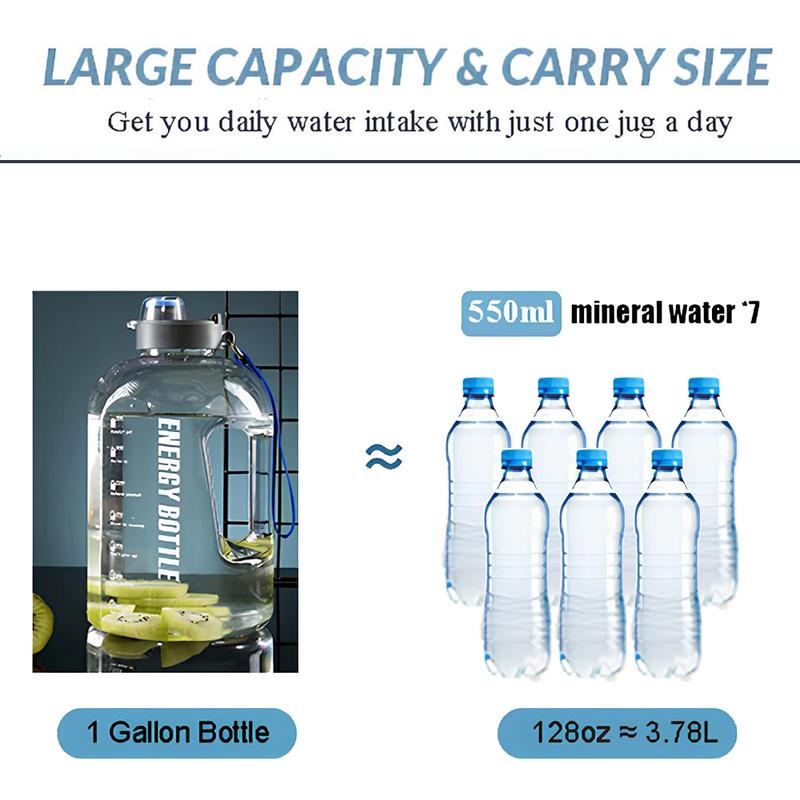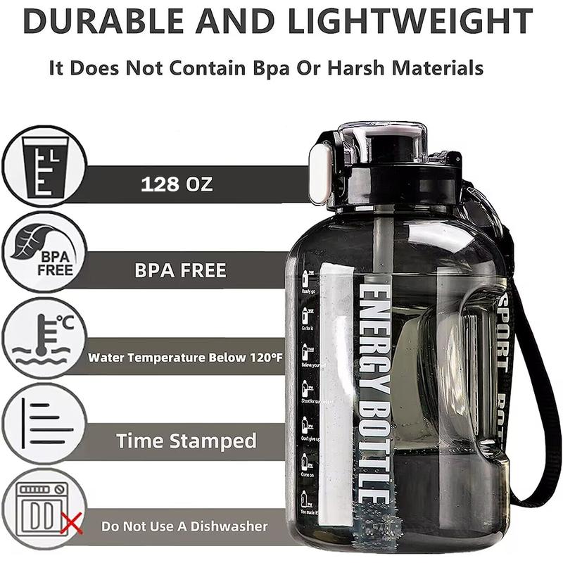 Gallon water bottle, hot and cold water large capacity water bottle, 128 oz (with straw and time marker), leak-proof sports water bottle, BPA-free leak-proof large sports water bottle, reusable fitness sports water bottle Hydration
