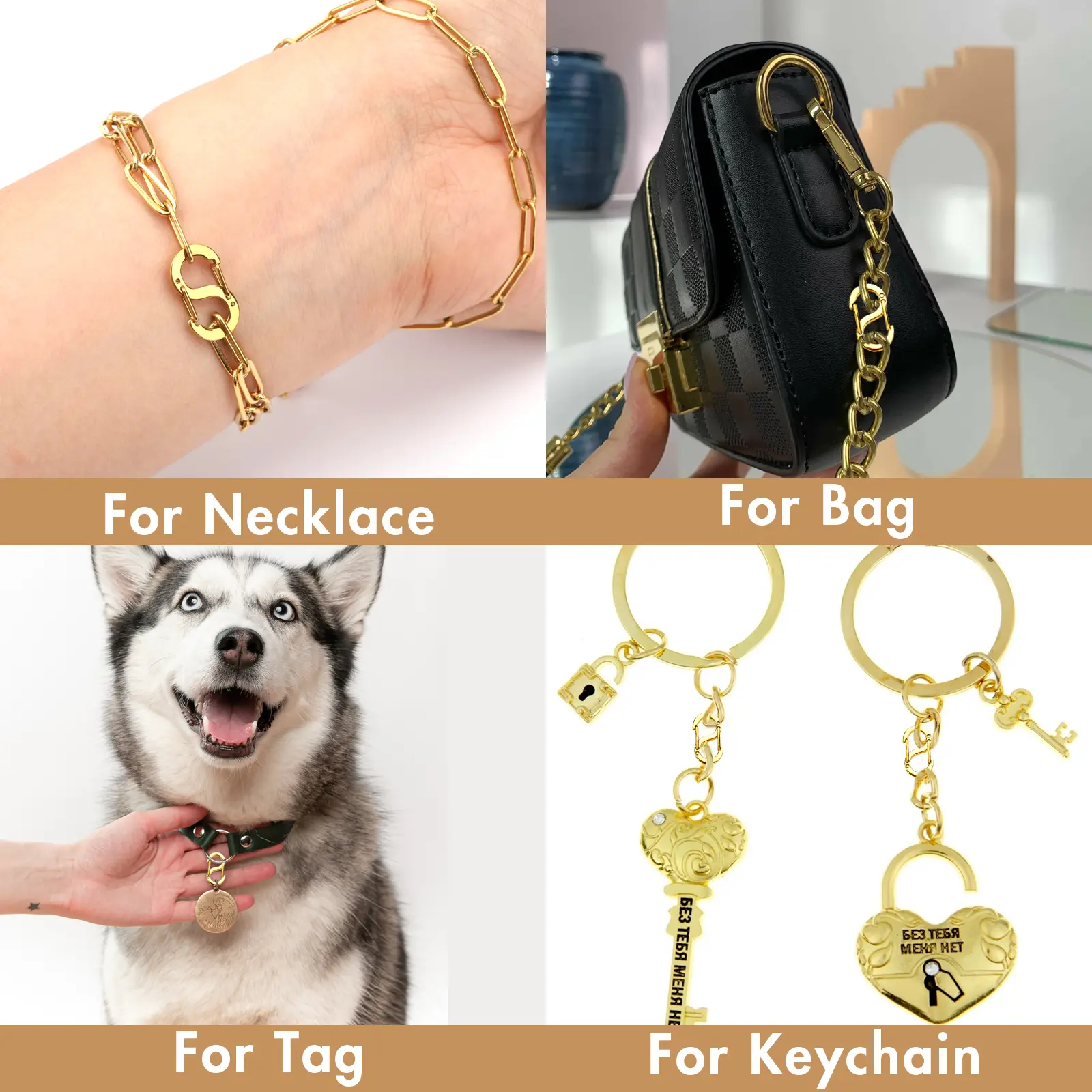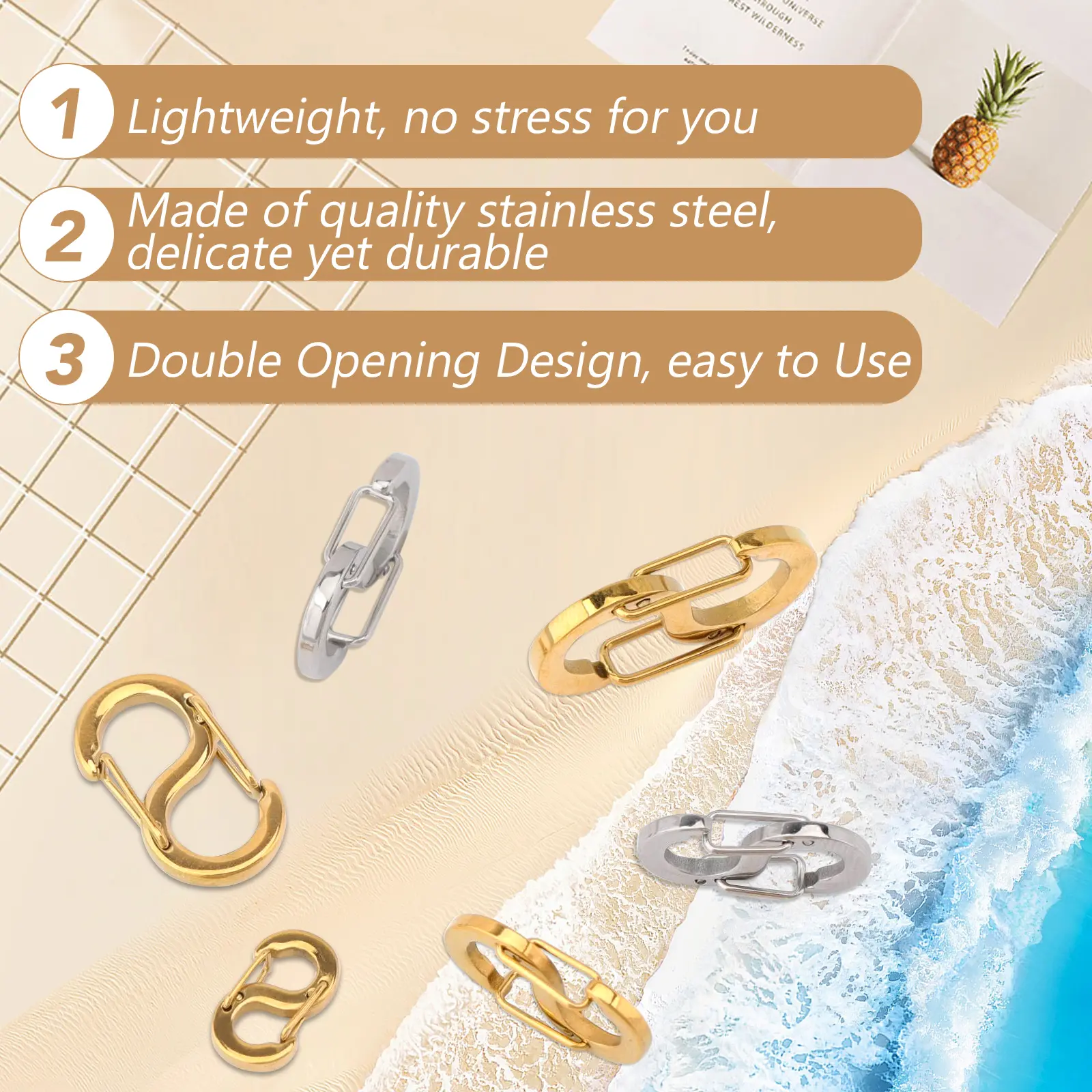 You'll receive 12 pieces of necklace shortener. Necklace clasp with double opening appearance,The appropriate size fits most necklaces and bracelets. Durable Material:Our necklace shortener are made of high quality 316 stainless steel.NO nickel and allergy free,stronger and more durable,can use them for a long time Jewelry Extender: The clasp can be used as bracelet or necklace extender for jewelry making, if you have bracelets or necklaces that need to be repaired, you can use the clasp to connect the broken part, it is convenient and helpful. Easy to Use:You just press the spring, hang on the small items and turn off, it will keep your things from falling off.