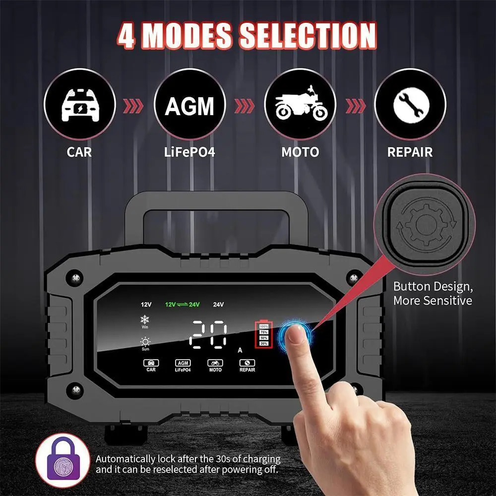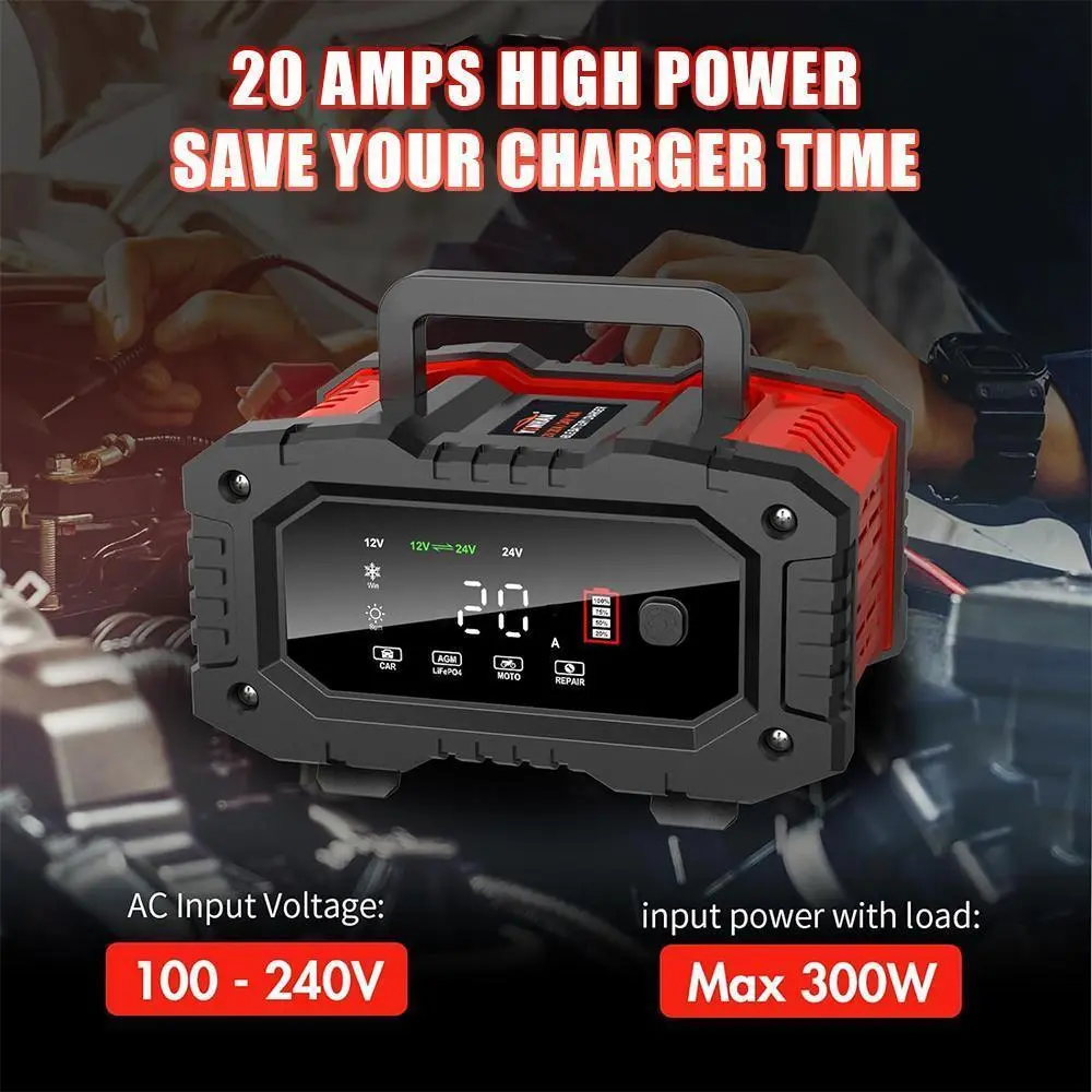 ·【Upgraded 20-Amp Quick Battery Charger】The NEW version intelligent battery tender, the charging speed is 12V@ 20Amp and 24V@ 10Amp, which is much faster than 10A or 6A automatic chargers. Designed to charge, maintain and repair all 12-volt and 24-volt lead-acid automotive, LiFePO4, marine and deep-cycle batteries including AGM,GEL,EFB,SLA,Flooded(WET),Calcium in cars, truck, SUVs, ATV, motorcycle, snowmobile, lawn mower, boat, tractor, forklift, golf cart, etc.NOTE: LITHIUM BATTERY DISABLED.