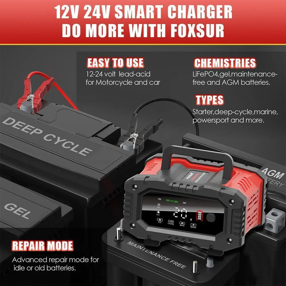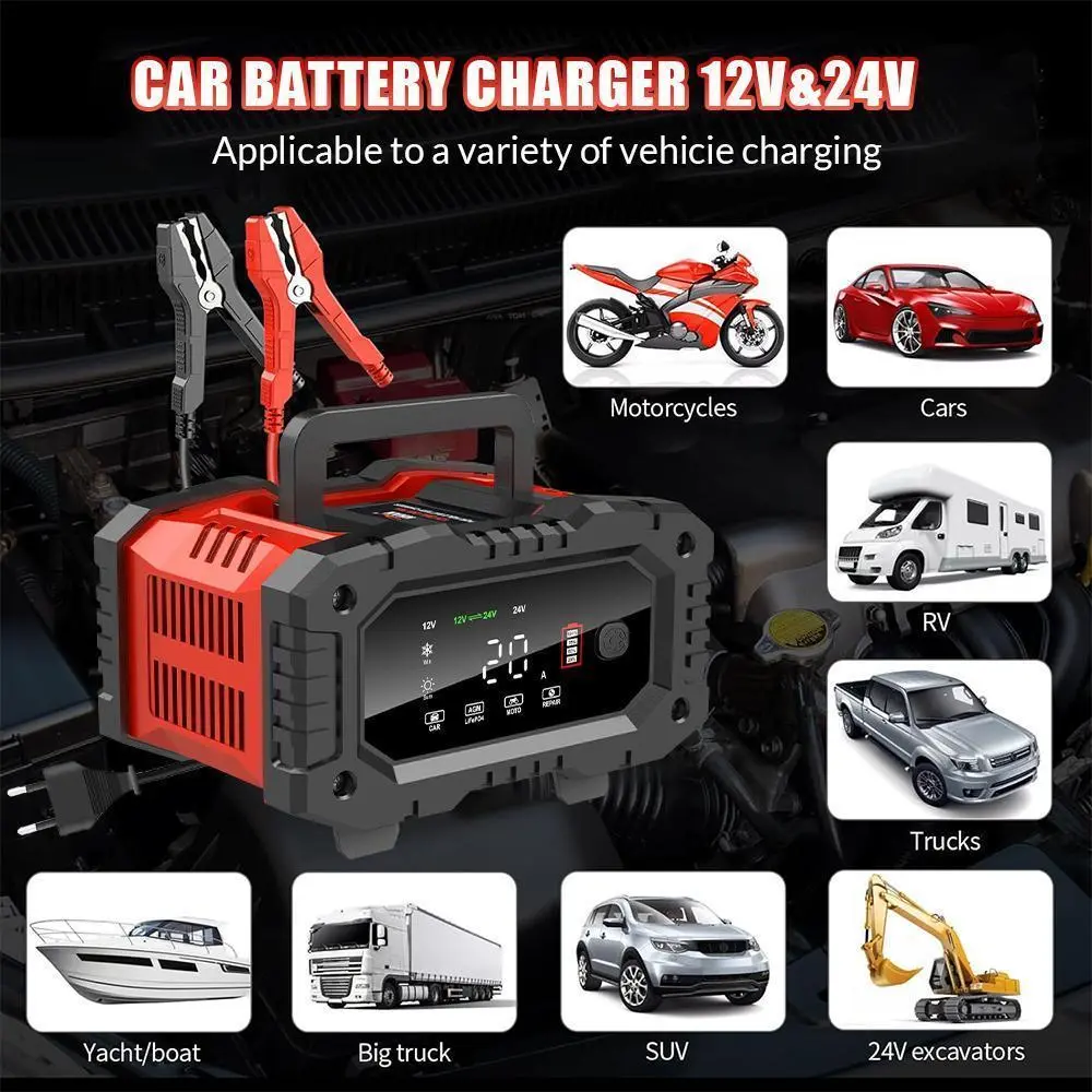 Charge, repair and maintain 12-volt and 24-volt lead-acid automotive, LiFePO4, AGM, GEL, EFB, SLA,VRLA,Calcium ,Flooded(WET) batteries.Not for lithium-ion battery.