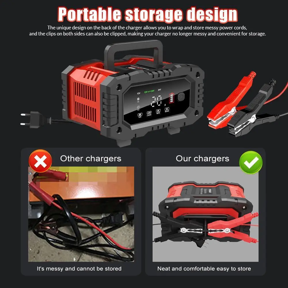 ·【Clip Organizer & Foldable Handle Design】Our innovative battery charger and maintainer owns an unique design on the back of the charger, alowing you to wrap and store messy power cords, and the clips on both sides can also be clipped,which makes your charger no longer messy and convenient for storage. The top portable handle design,which can be folded for easy carrying storage and using.The bottom bracket of the charger provides a new posture for more comfortable viewing angle and operation.