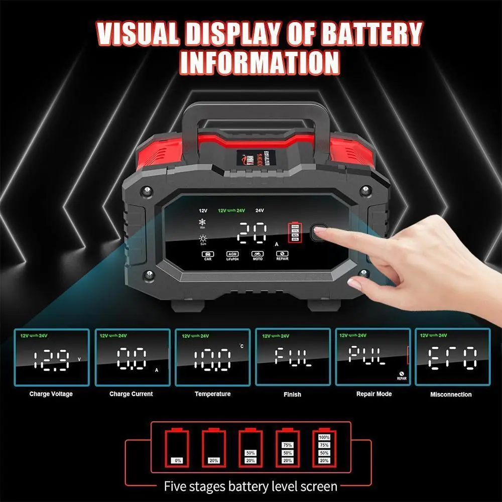NEW VERSION INDUSTRIAL GRADE LARGE LCD 12V/20A, 24V/10A SMART BATTERY CHARGER