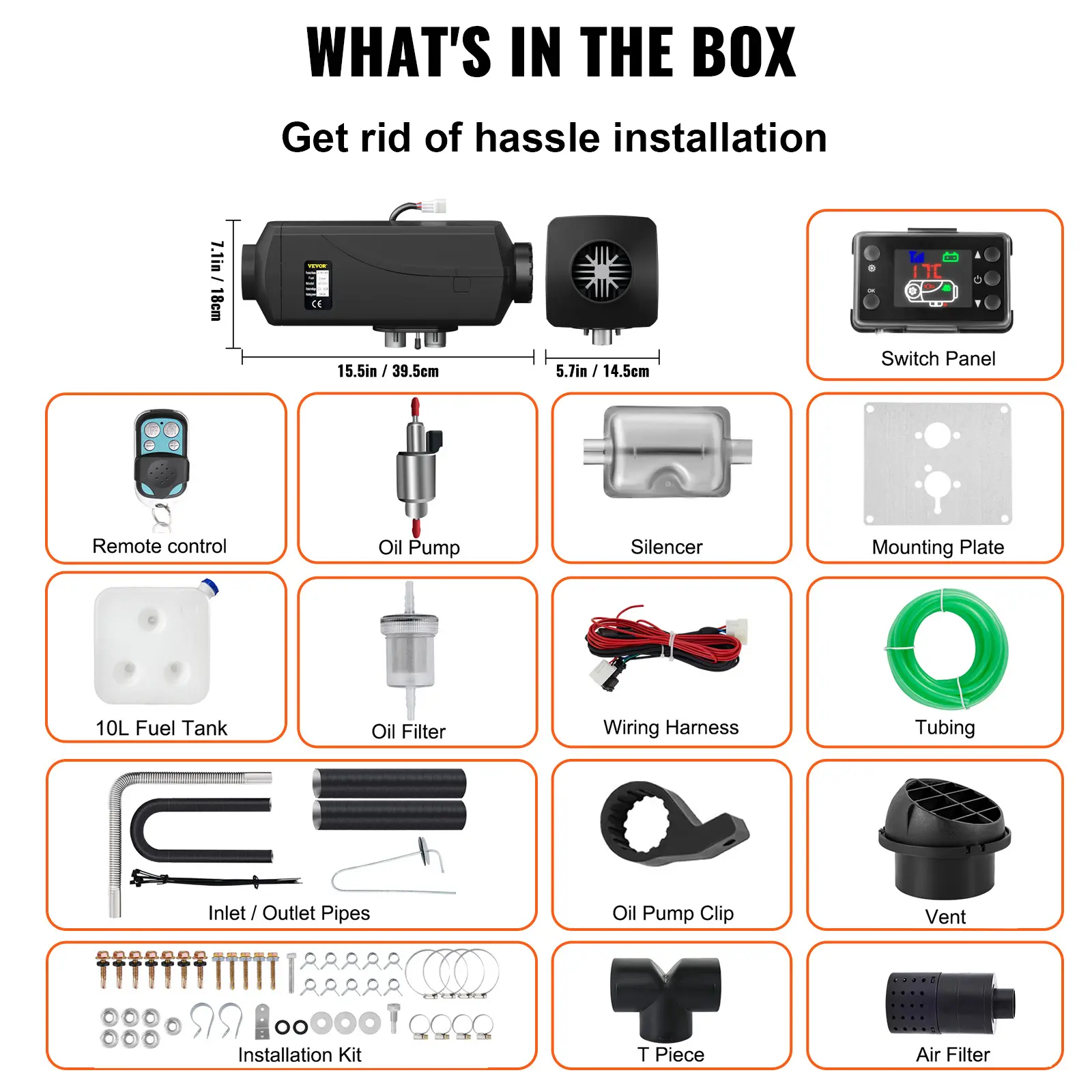 • Effortless Installation: Complete Accessories: 1 x Oil Pump, 1 x 10L Tank, 1 x LCD Switch, 1 x Remote Control, 1 x Silencer, 1 x Oil Filter, 1 x Air Filter, 1 x Inlet Pipe, 1 x Exhaust Pipe, 1 x Installation Kit. The full accessories set makes it a breeze to install this parking heater in your vehicle. It can be flexibly installed in the passenger room, trunk, or under the container.