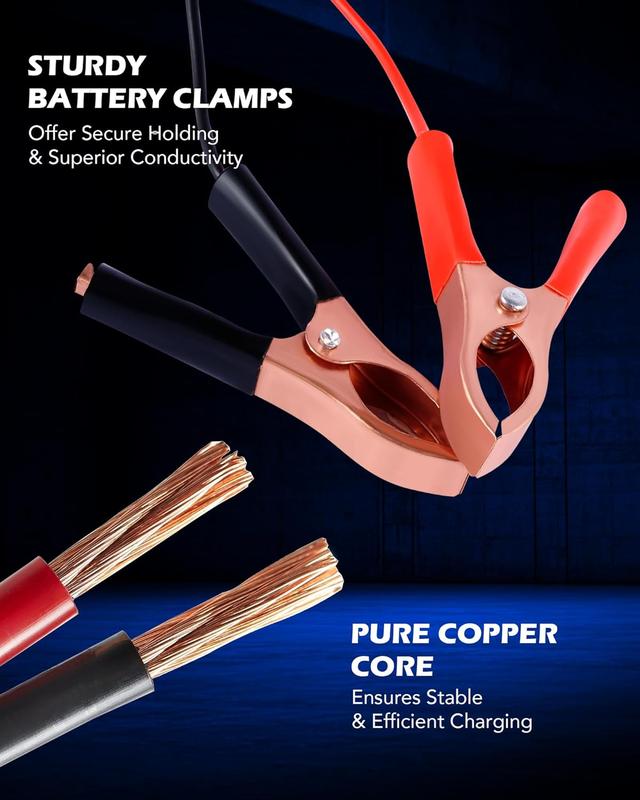 Fix the battery clamps and plug in the charger to enjoy efficient charging and safe maintenance; prevents short circuits, overcurrent, overheating, high-voltage spikes, and low-voltage dropouts for maximum safety