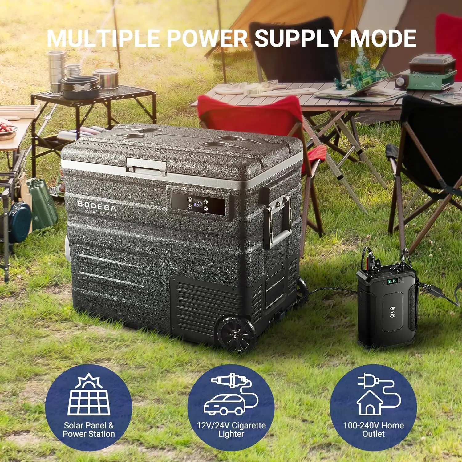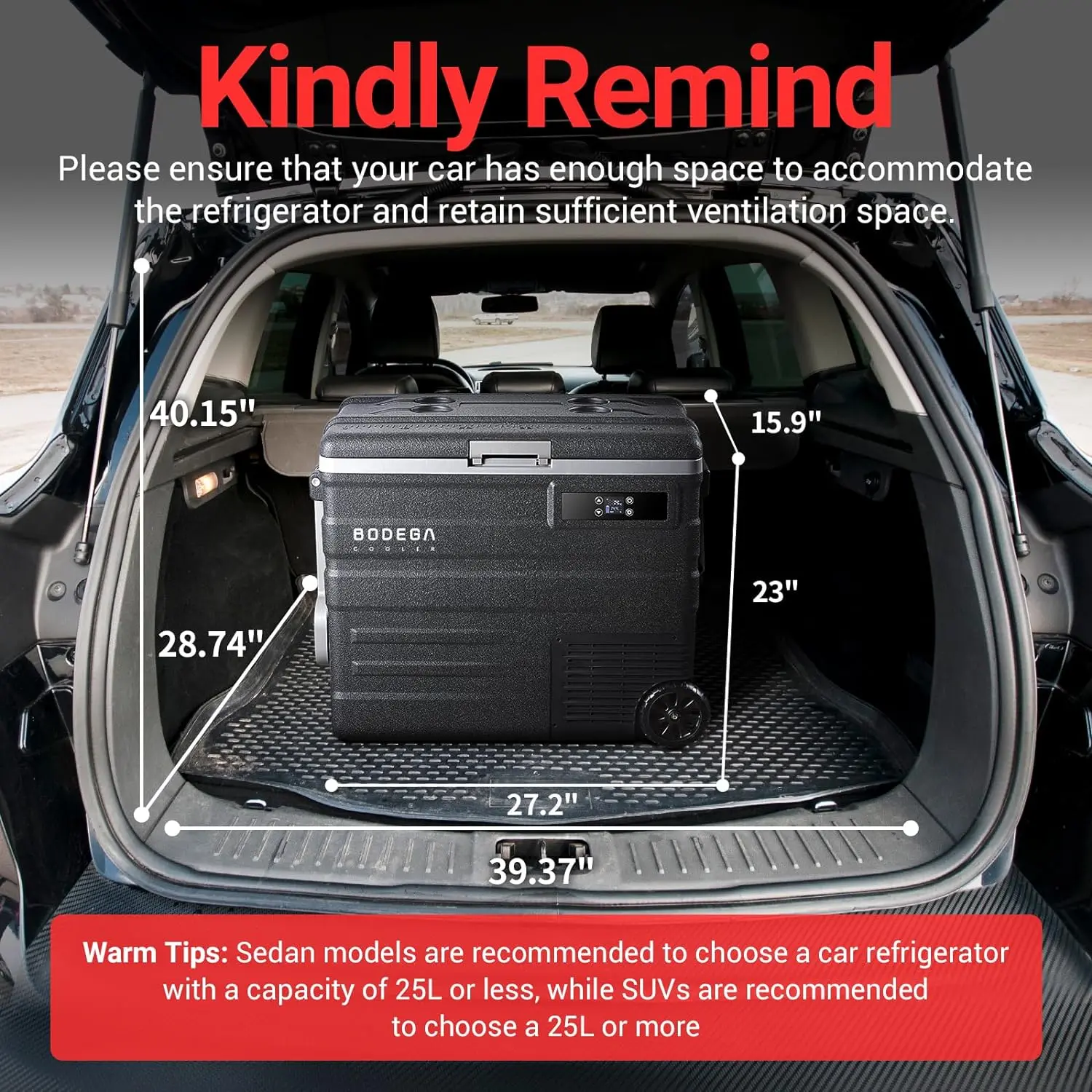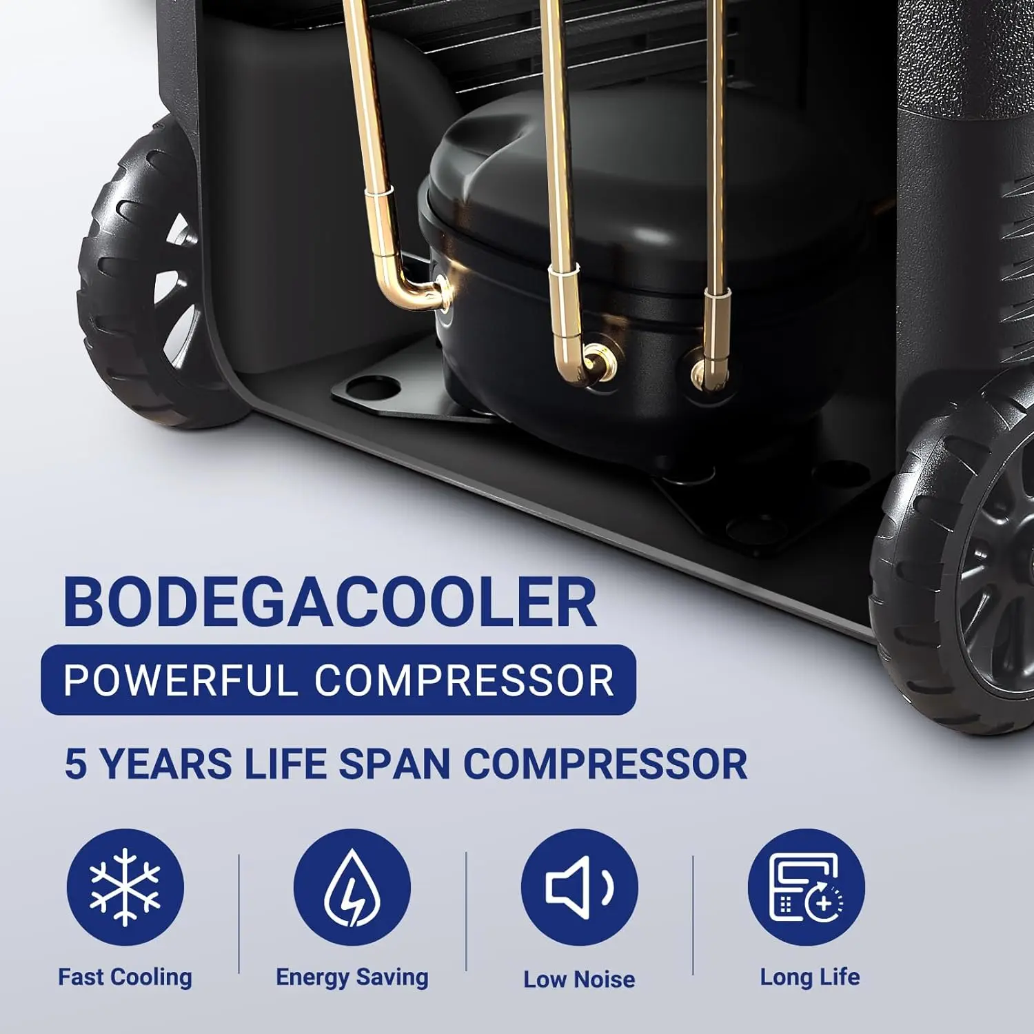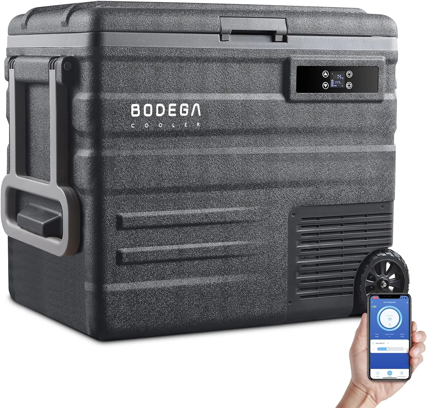 ·APP CONTROL & VOLTAGE PROTECTION:Upgraded WiFi connection car refrigerator. BODEGACOOLER car fridge with APP control, you can control the freezer from distance or in car.Intelligent temperature control function to meet the required temperature of various ingredients. H/M/L 3-level low-voltage protection:When the measured DC voltage falls below the cut-off value, the compressor will off to prevent the vehicle from running out of power.