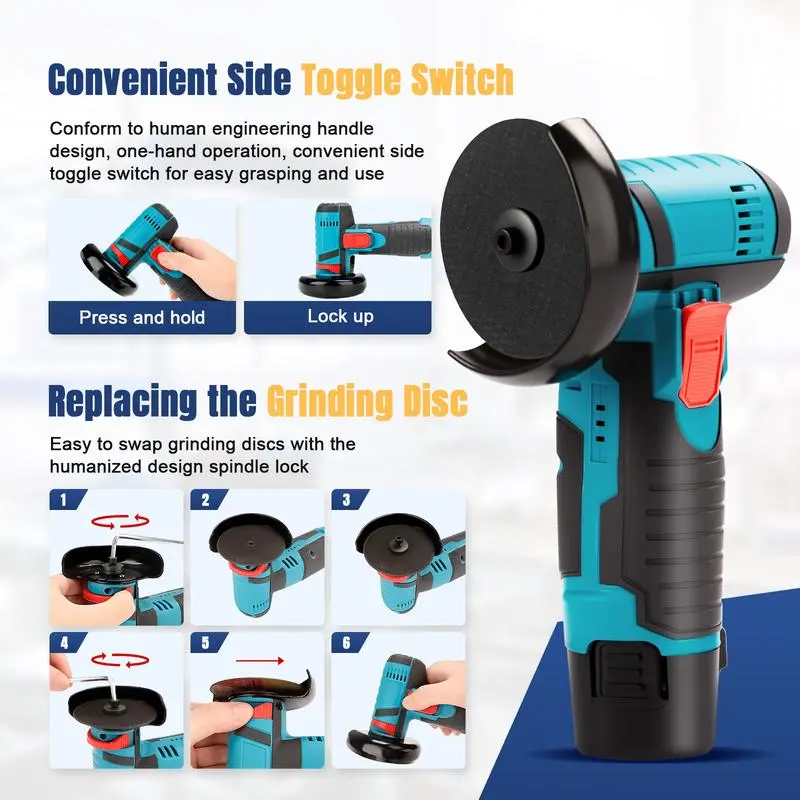 ·【Mini & Compact】12V angle grinder is designed to be lightweight. and can be operated by either man or woman with one hand.Widely used for grinding, cutting, sanding and polishing processing of various materials, including metal, tile, concrete, pipes, conduits and other solid materials.