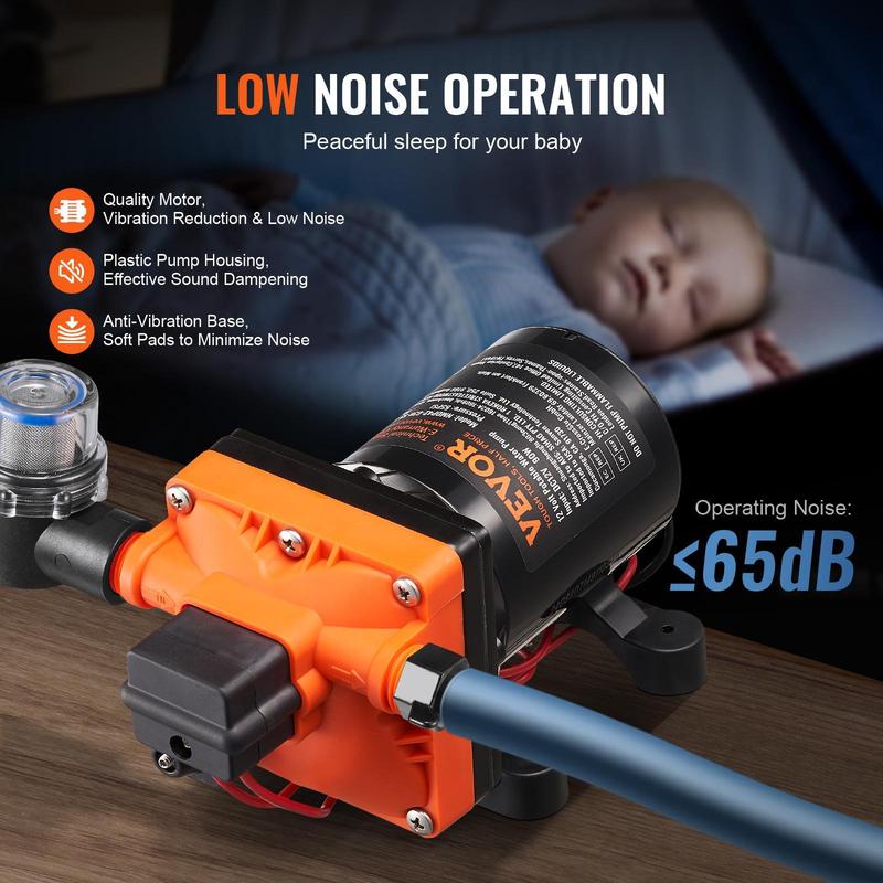 • Ultra-Quiet Operation: Our 12V diaphragm pump features a pure copper motor for smooth and quiet performance. The plastic pump body and noise-reducing base effectively minimize sound, so it won't disrupt your work or sleep.
