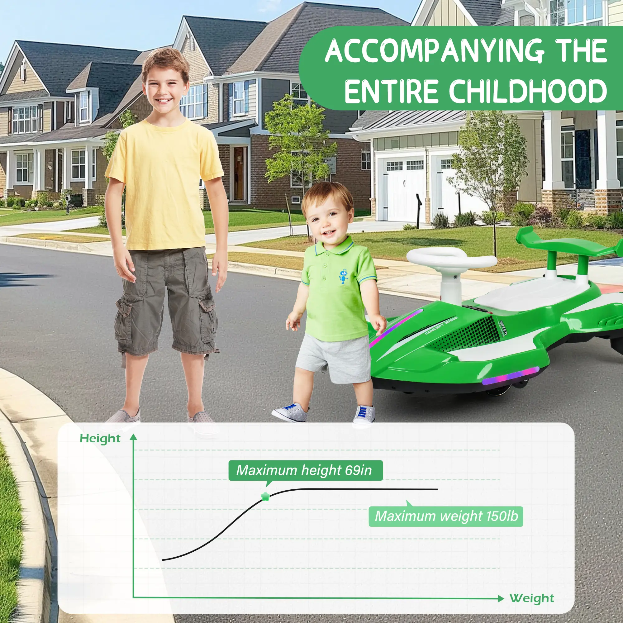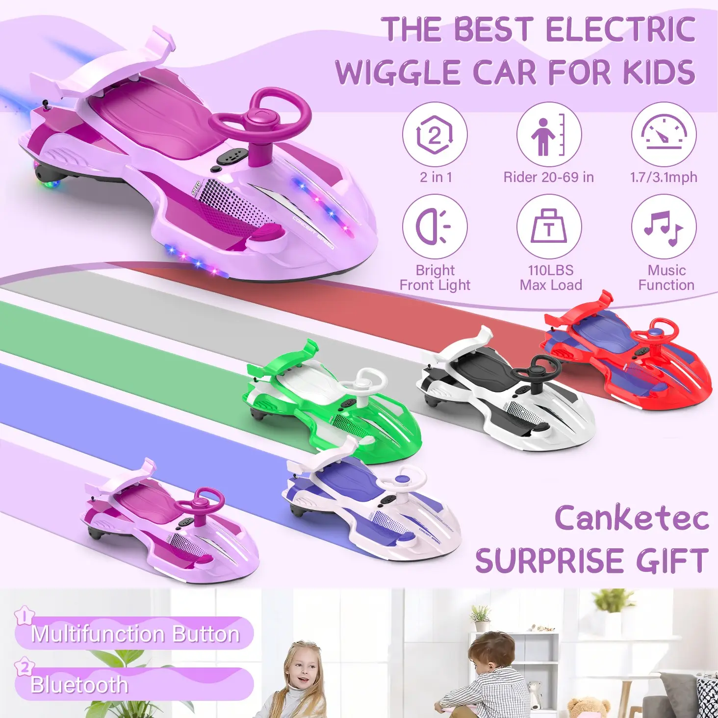 Ā·ć2 IN 1 ELECTRIC WIGGLE CARćDesigned with both electric and manual mode. This kids ride on drift car is equipped with 12V 4.5AH rechargeable battery, high&low speed, speed up to 1.2 -3.1 mph, max weight load: 110 lbs. Real driving experience makes kids just like real racers.