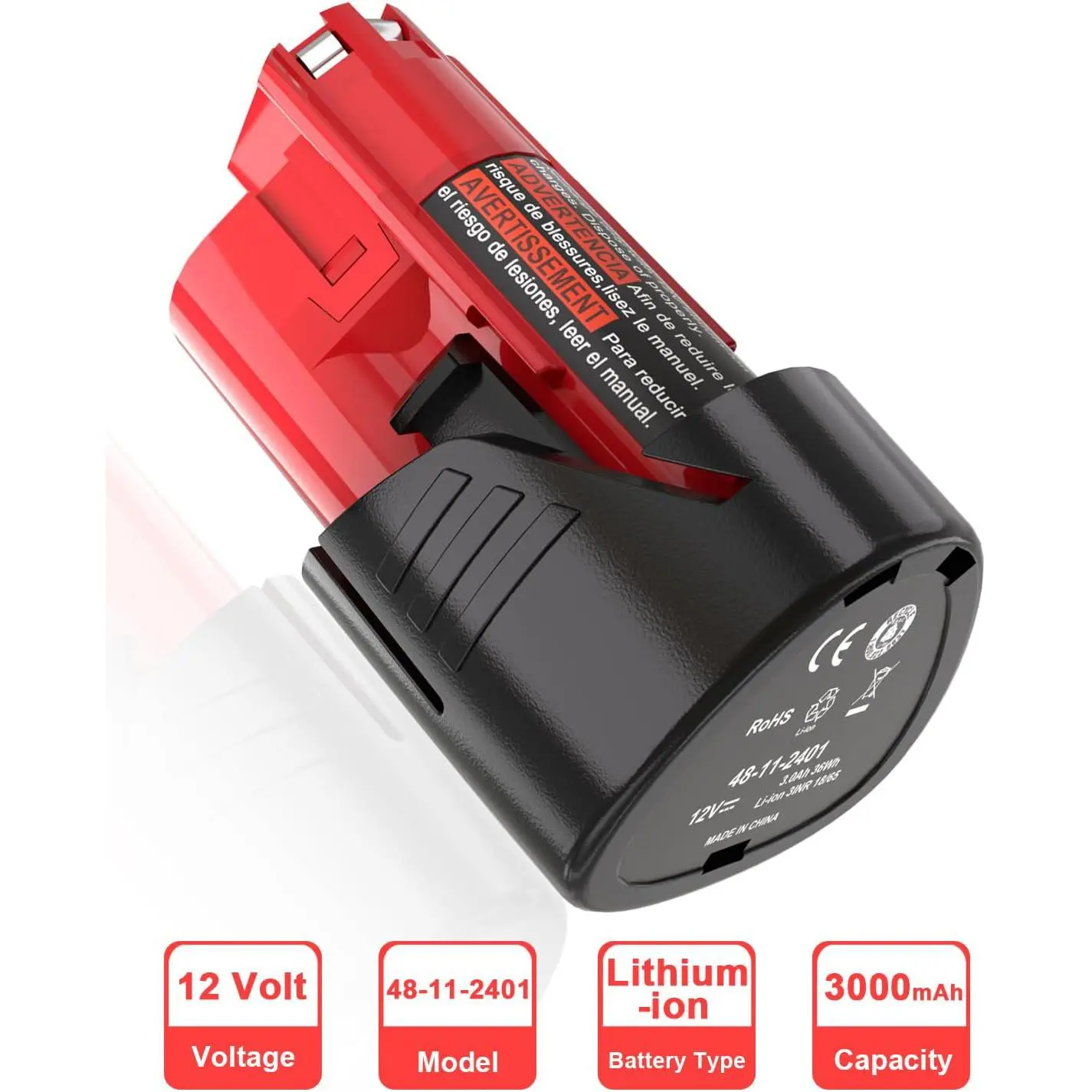 This 3Ah 12V Lithium battery is a compatible replacement for Milwaukee ∧∧-12 tools. It fits models 48-11-2401, 48-11-2412, 48-11-2420, 48-11-2440, and 48-11-2460. It offers extended capacity and safety features. Charge it with your original ∧∧-12 battery charger.