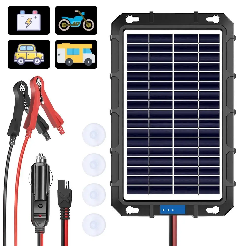 4,Solar charger is perfect for cars, trucks, motorcycles, campers, RV, boats, tractors, lawnmowers, farm equipment, and most 12-volt cycle batteries.