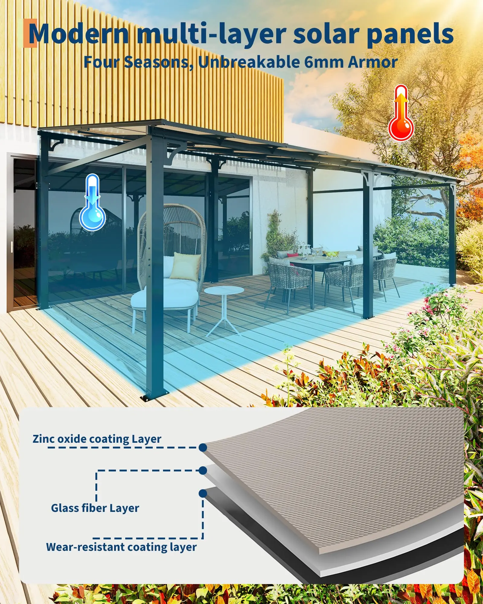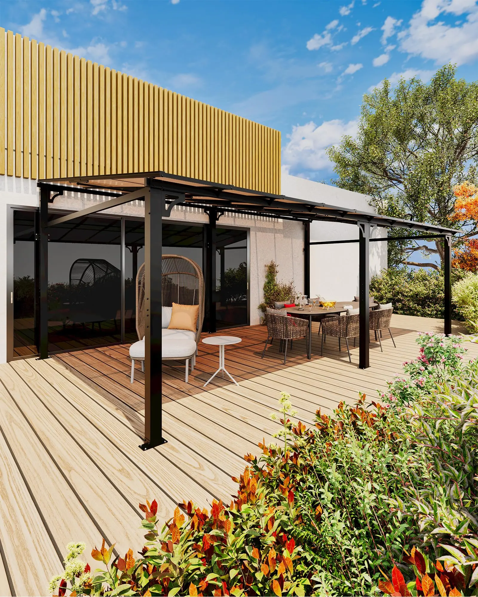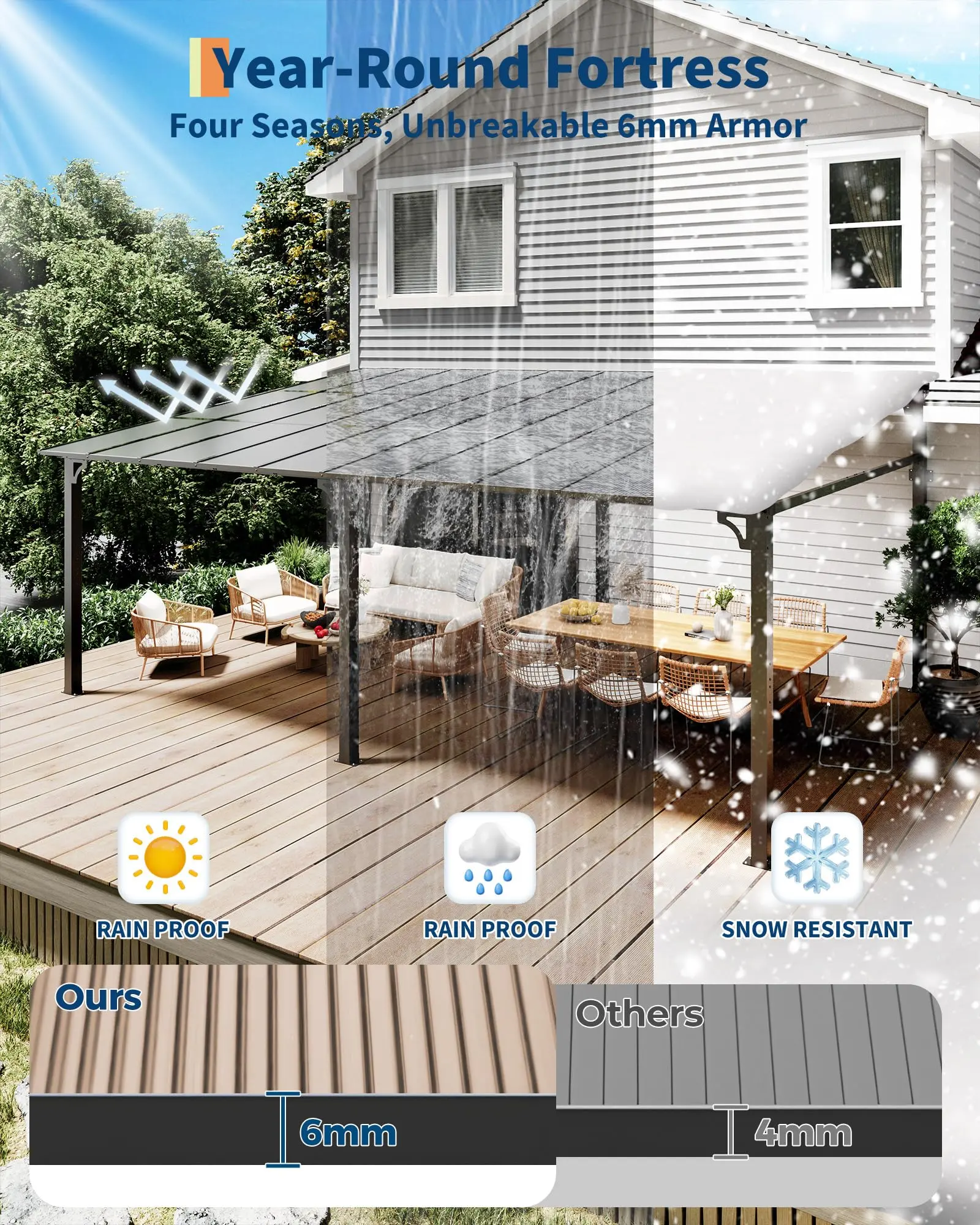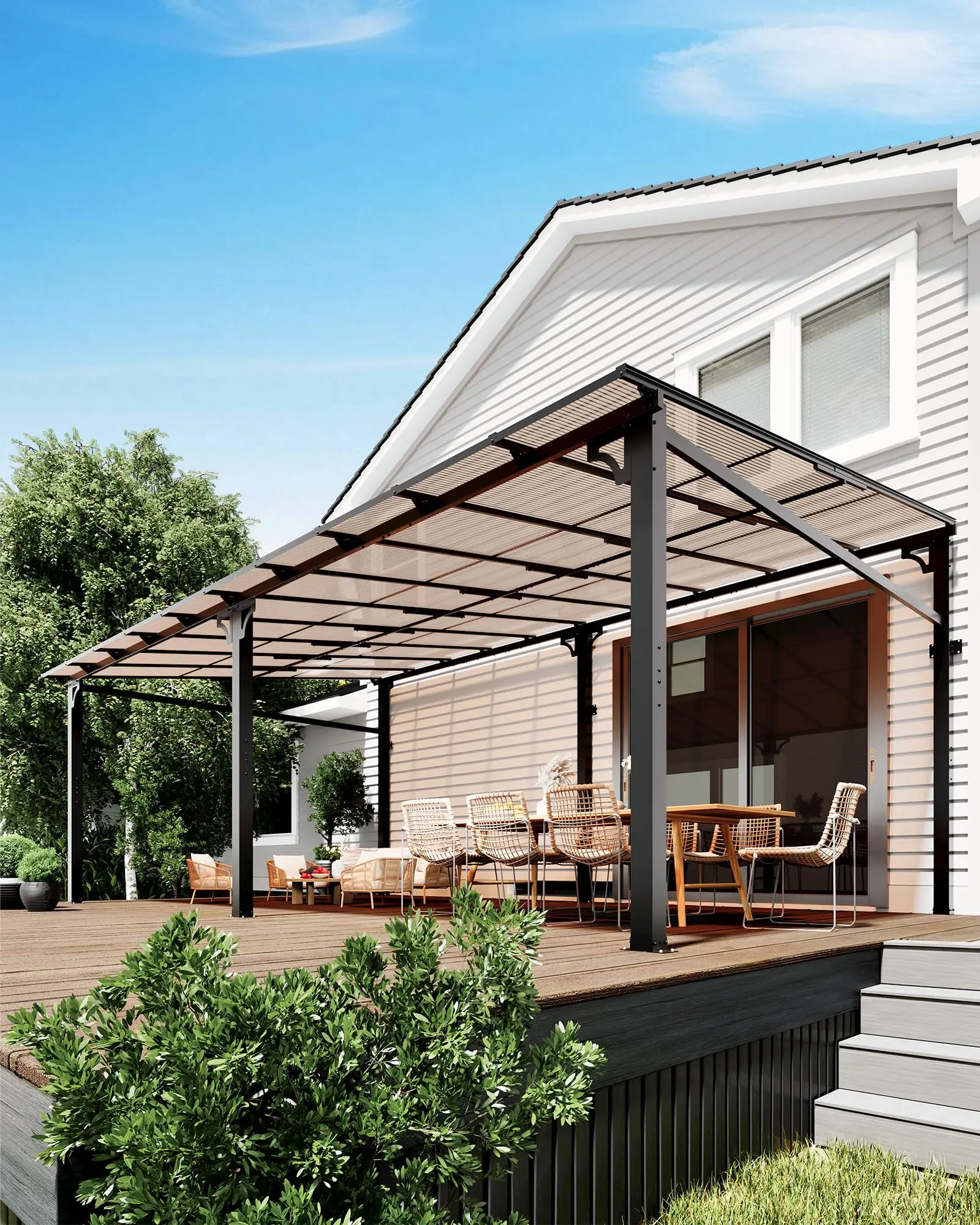 · SEAMLESS INDOOR-OUTDOOR TRANSITION: Step directly from your home into a sheltered oasis with this attached pergola. The open-sided design (no doors needed) offers instant access to fresh air and shade, while the 6mm polycarbonate roof blocks rain and UV rays. Ideal for coffee breaks, BBQ prep, or evening relaxation without exposure to the elements.