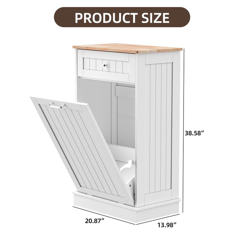 Overall size: 20.87"L × 13.98"W × 38.58"H (trash can not included). The tilt-out compartment fits most 13-gallon trash cans, allowing easy access. The flat top provides extra surface space for small appliances, décor, or everyday items. Ideal for kitchens, living rooms, bedrooms, apartments, dorms, or laundry rooms. 🏠