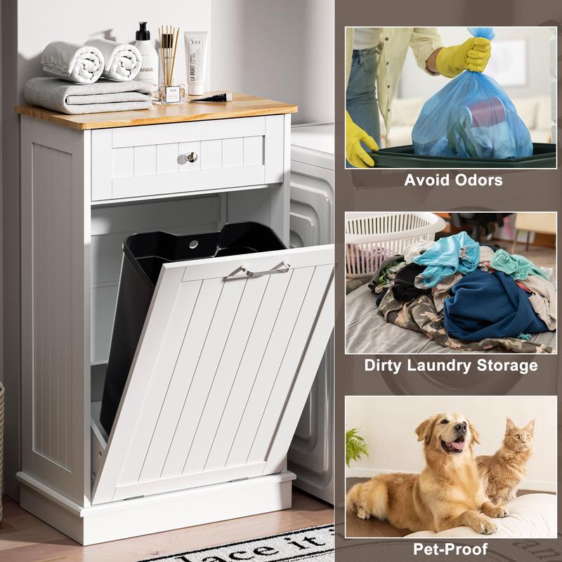 The tilt-out door fully conceals trash cans or laundry hampers, keeping floors neat and organized. This enclosed design helps reduce odors and prevents pets from tipping over or accessing the trash. 🐾