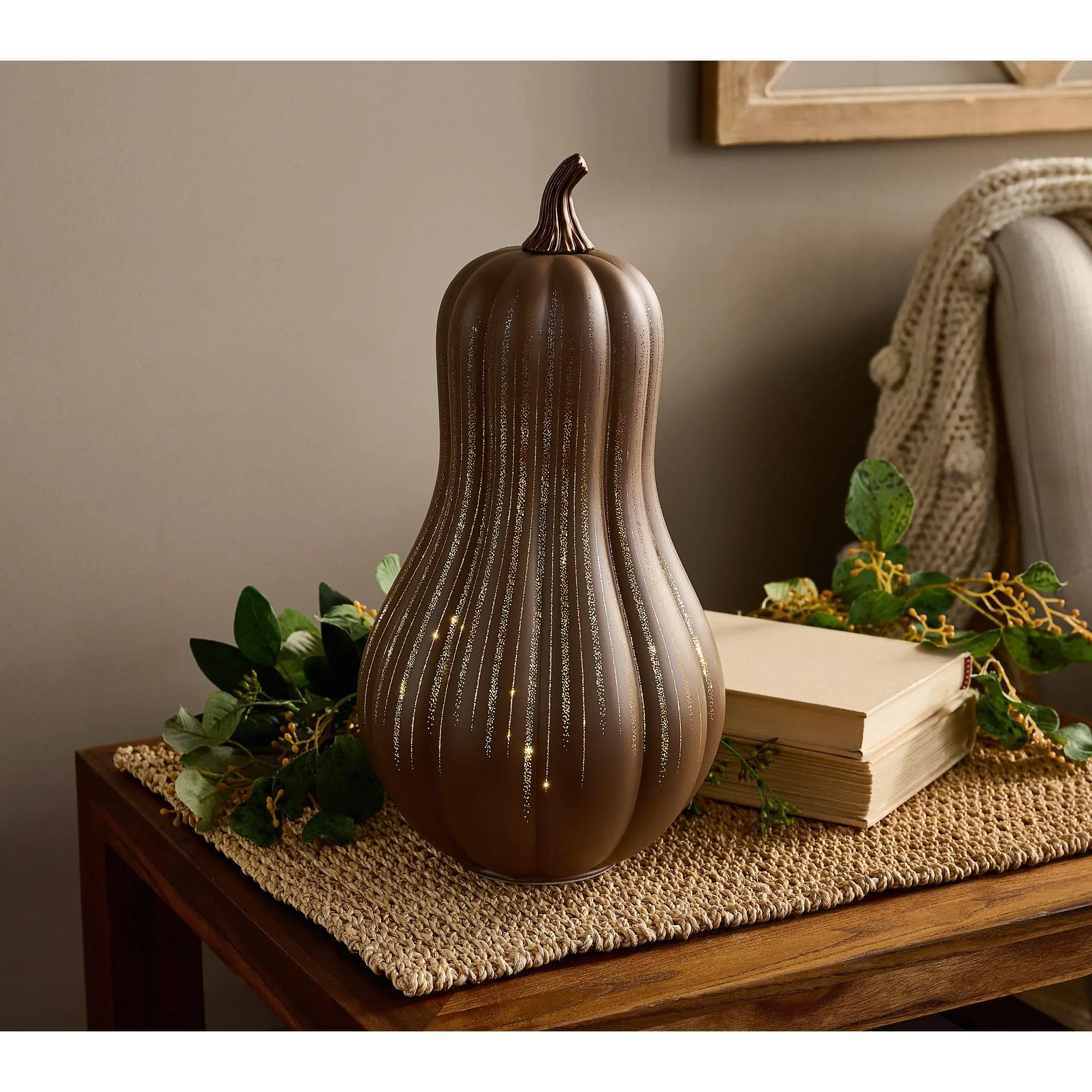 The illuminated starry night gourd by Valerie Parr Hill is the perfect addition to any autumn or thanksgiving decor! 🍂 The twinkling lights are so beautiful ✨ This one is in the color chocolate.  #falldecorfinds #autumndecor #thanksgivingdecor #starrynightgourd #cozyfallvibes