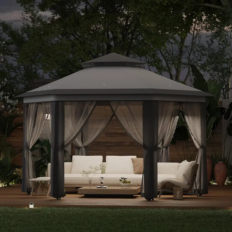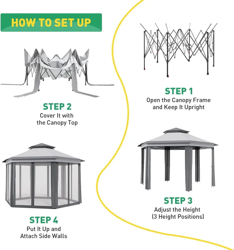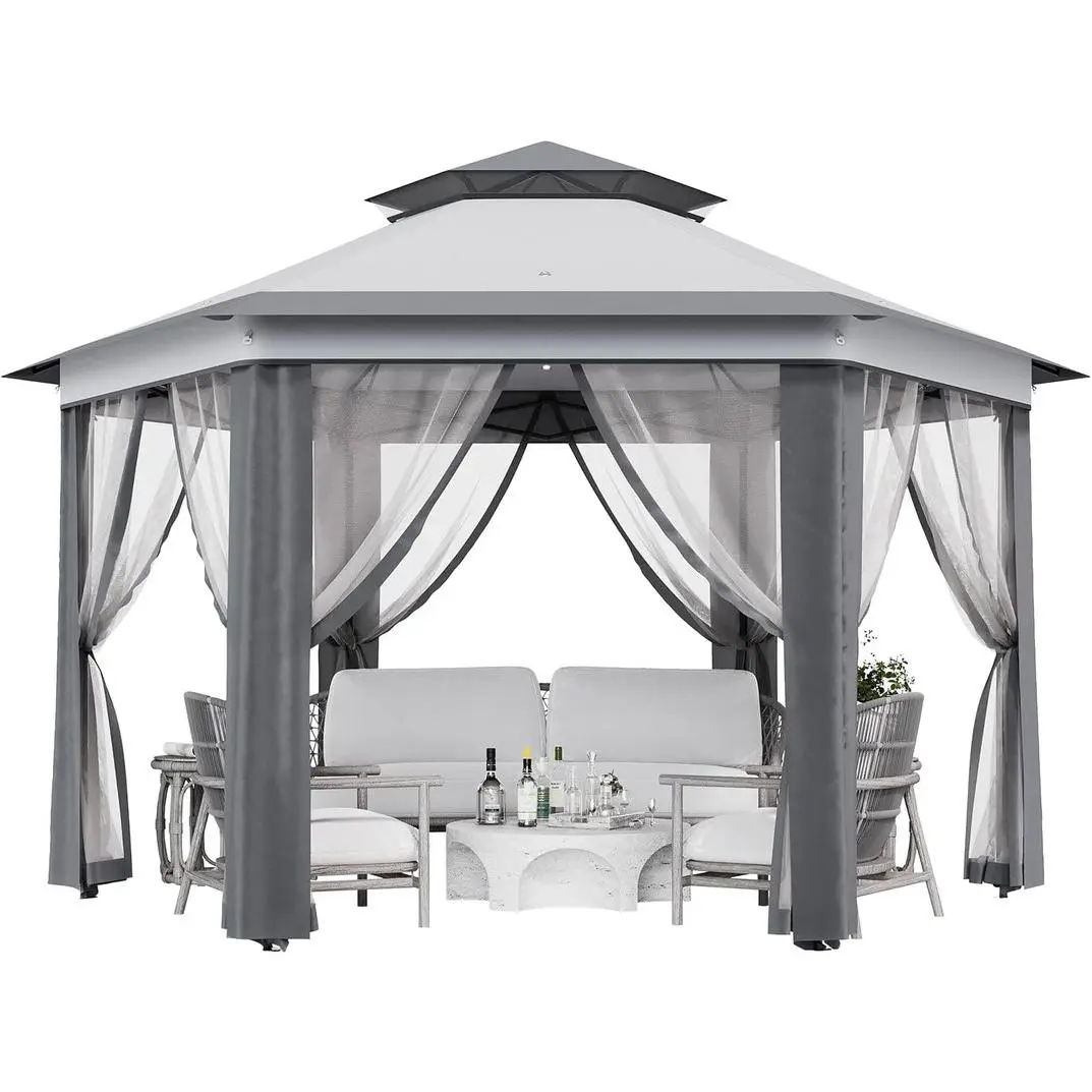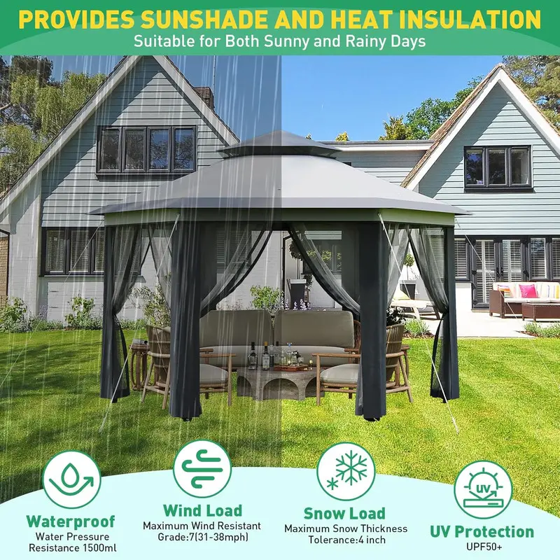 𝙎𝙥𝙖𝙘𝙞𝙤𝙪𝙨 & 𝙑𝙚𝙧𝙨𝙖𝙩𝙞𝙡𝙚 𝘿𝙚𝙨𝙞𝙜𝙣: Hexagonal shape provides 169 sq. ft. of shade, ideal for group gatherings, outdoor markets, or patio furniture. Adjustable height (6.2–9.2 ft) accommodates varying needs, and the ventilated roof design reduces wind resistance while promoting airflow.