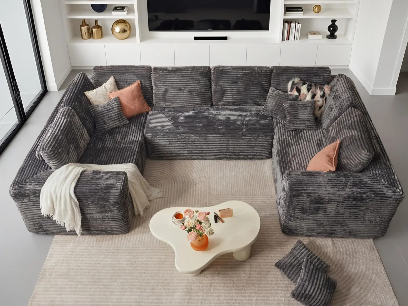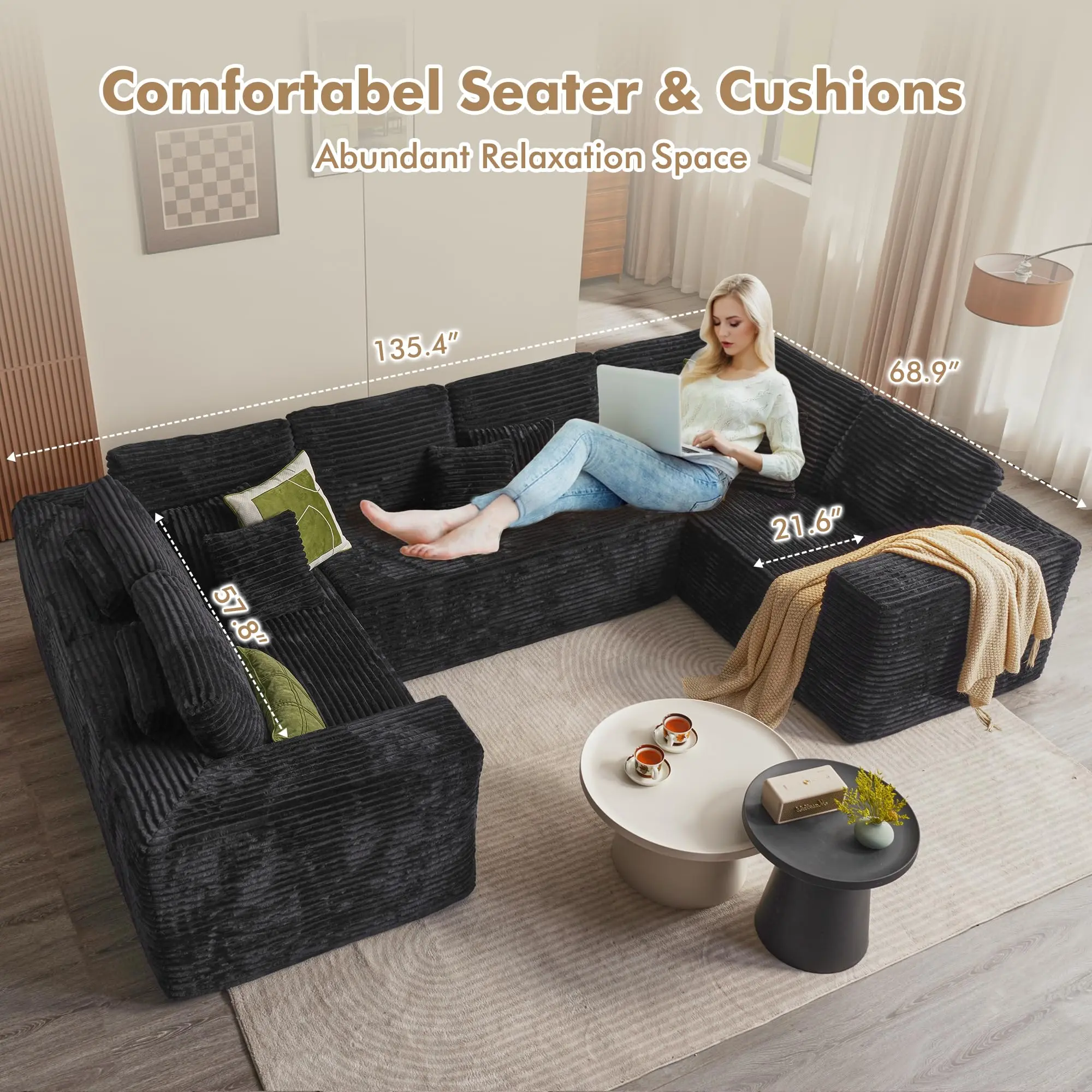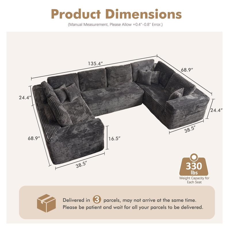 Elevate your living space with the 135" Cloud Sectional Couch, designed to provide comfort and style for your home. This modular floor boneless sofa features a plush corduroy upholstery, offering a cozy and inviting feel.