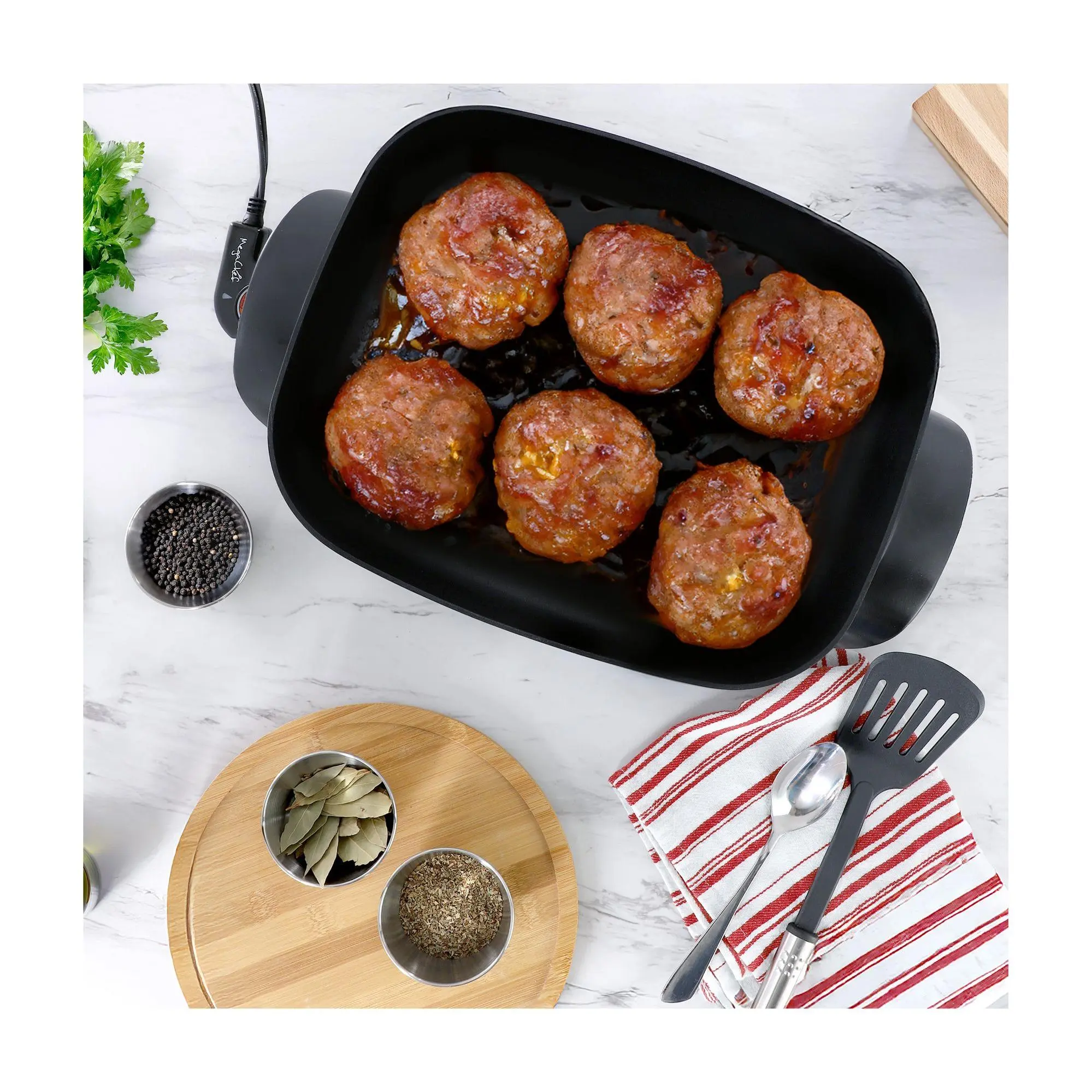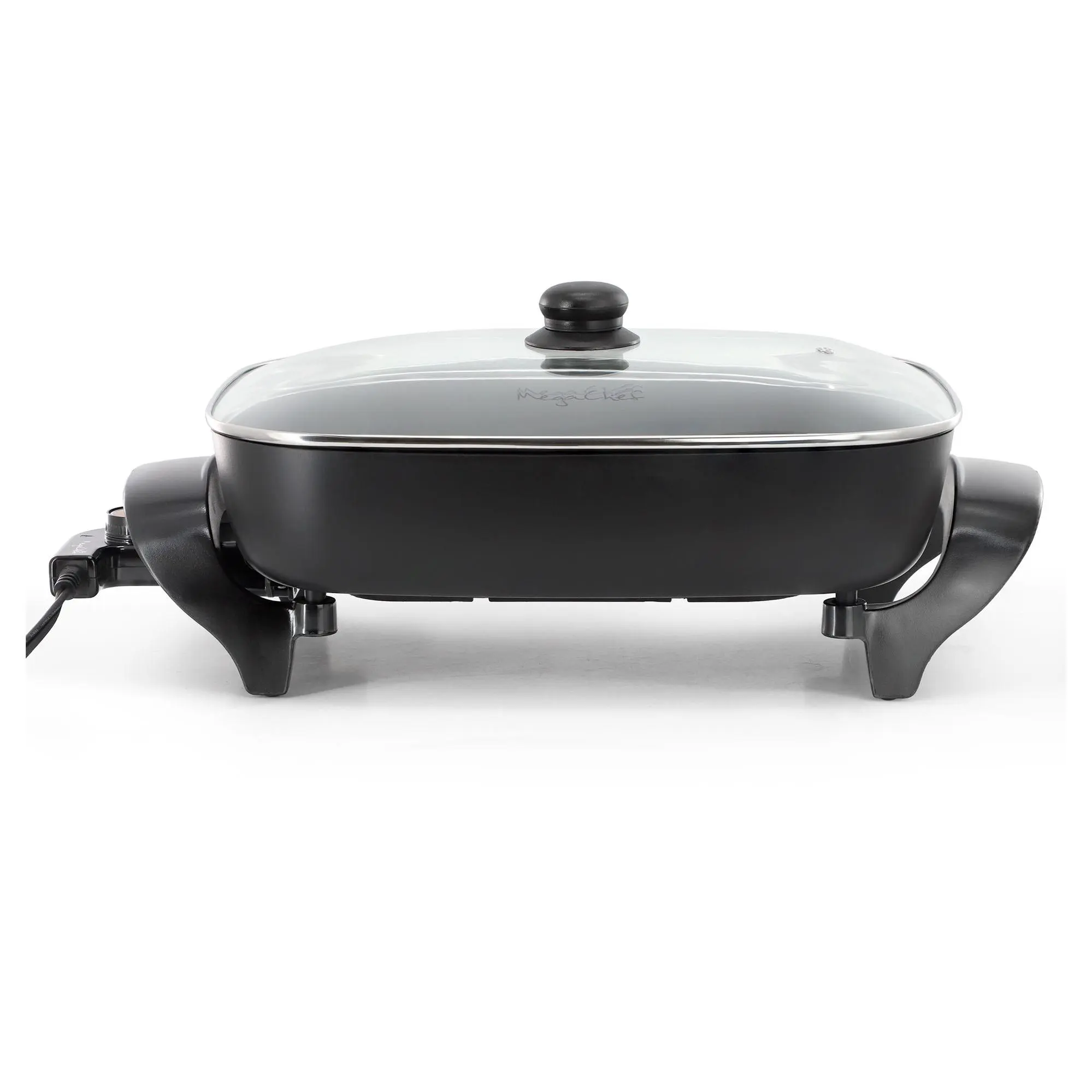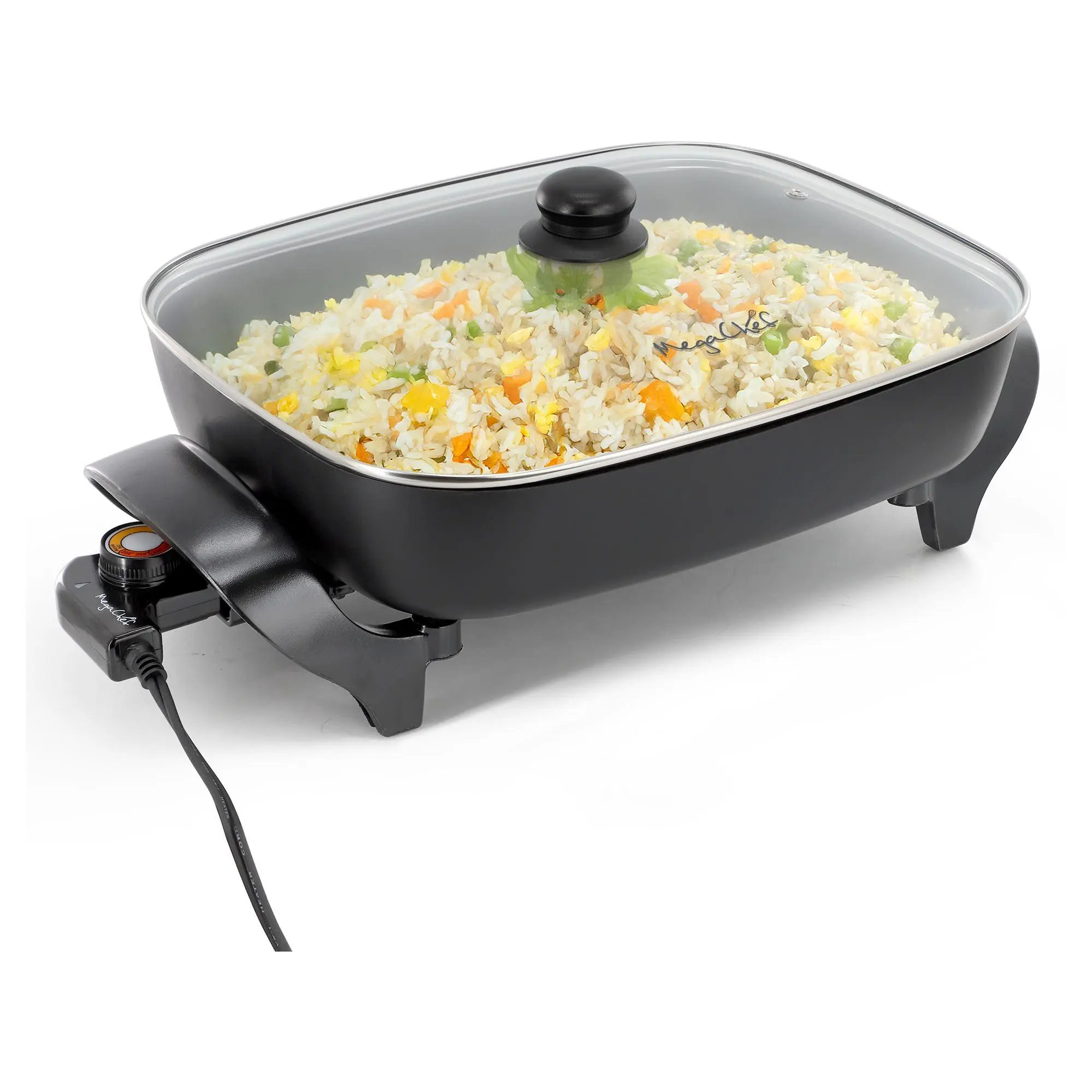 Imagine preparing a delicious family meal with ease. This electric fry pan offers an expansive cooking surface where you can quickly whip up everything from hearty breakfasts to sumptuous dinners. Its non-stick coating ensures food slides right off, making cleanup effortless. With an adjustable thermostat, you control the heat for perfect results every time, while the glass lid lets you watch your meal come to life. From MegaChef.
