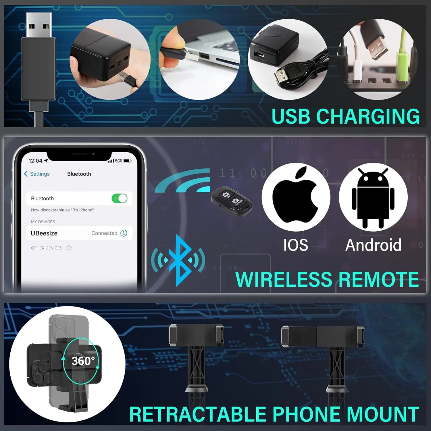 Excelente producto, el aro led tiene buena y puedes adptar el celular, trae un contro con bluetooth para conectarlo al celular