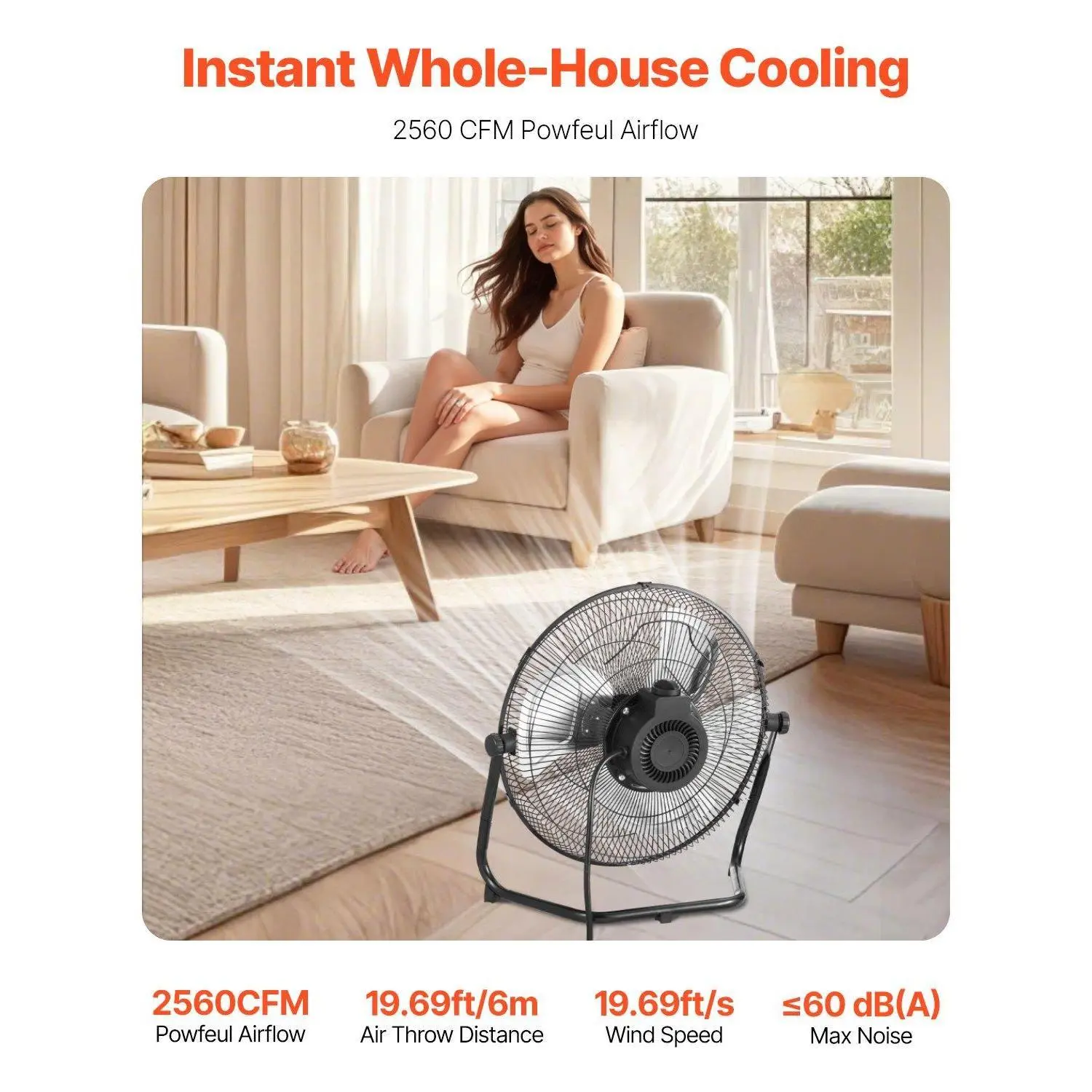 ·High-Speed, Low Noise: Our high velocity floor fan features a 3-speed dual ball-bearing motor, delivering up to 2560 CFM airflow with an outstanding air throw of 19.69 ft and remarkable wind speed at 19.69 ft/s. Besides, the max noise is below 60 dB(A), ideal for rapid but not loud cooling.