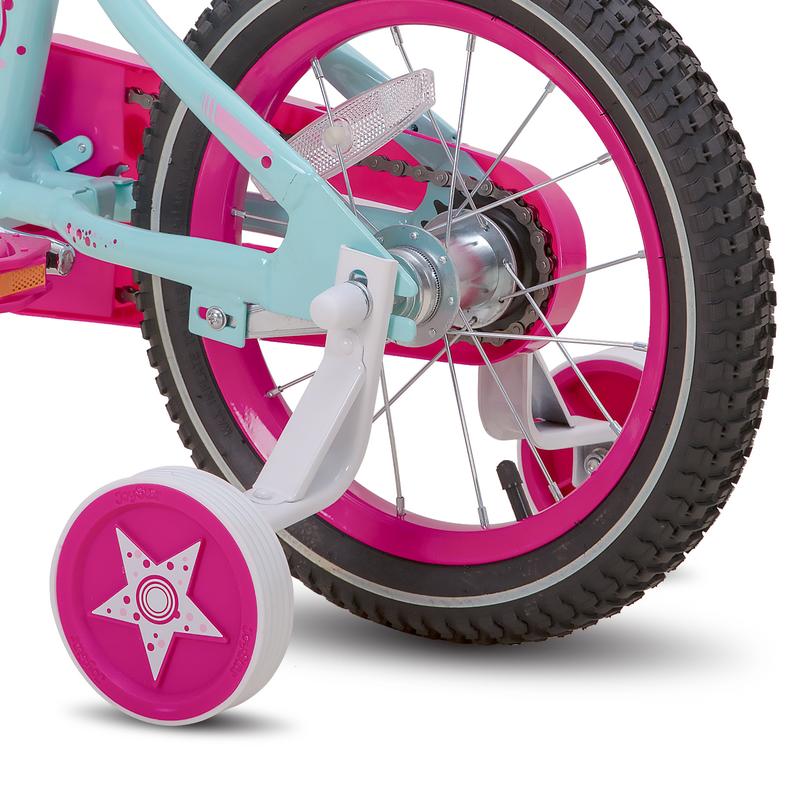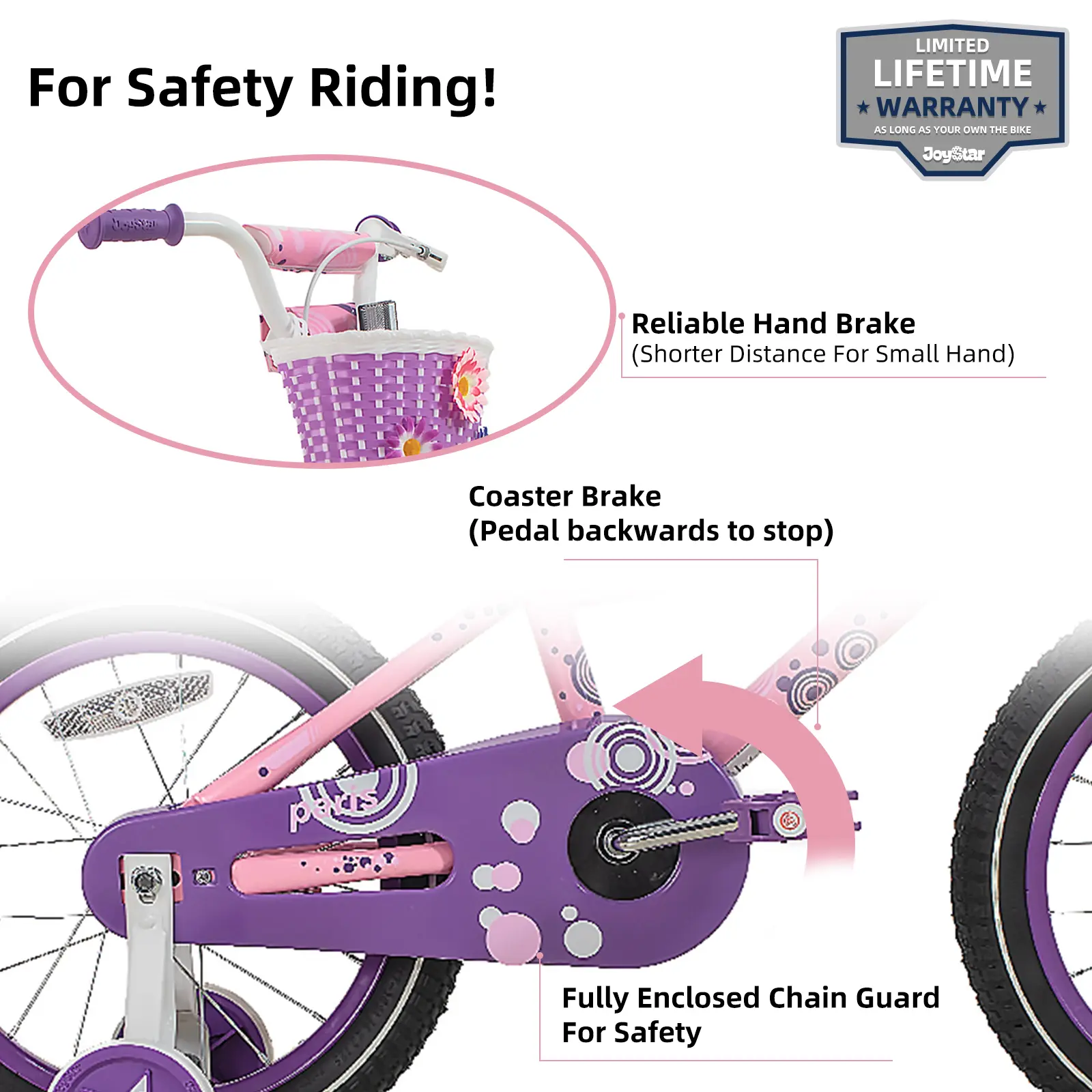 ·3, Front Handbrake and Rear Coaster brake are easy to provide effective stopping power when needed, so they can stay in full control, a great option for young riders. Enclosed chain guard, prevent your kids getting hurt. Removable training wheel will keep everything pointing in the right direction till she's ready to balance on her own.