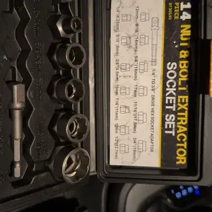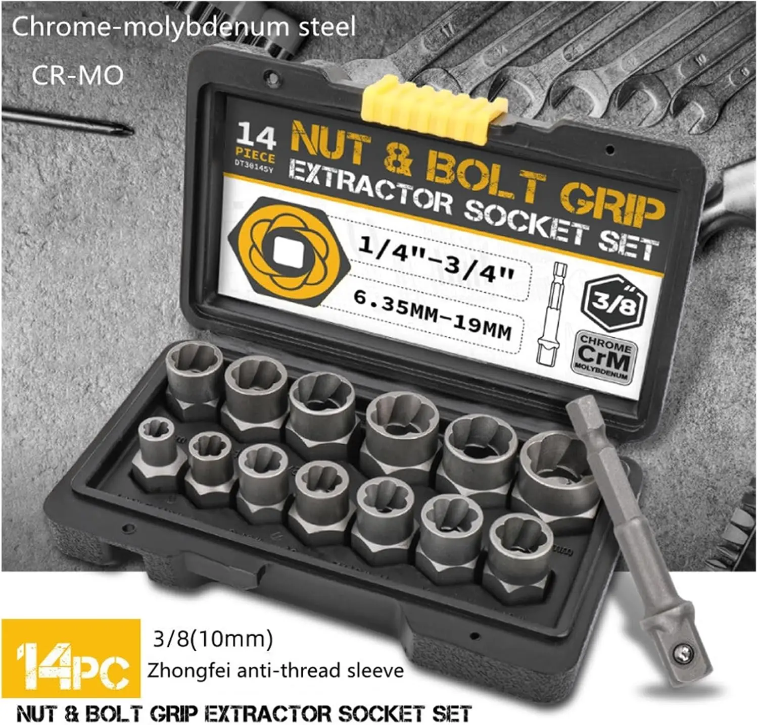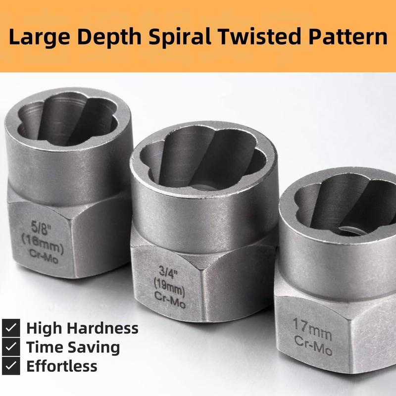 ·【Application】These Locking Wheel Lug Nut Removal Tools fit hex heads sized 6.35mm(1/4”), 8mm(5/16”), 9.5mm(3/8”), 10mm, 11mm(7/16”), 12mm, 12.7mm(1/2”), 13mm, 14mm(9/16”), 16mm(5/8”), 17mm, 17.5mm(11/16”), 19mm(3/4”) to quickly replace rusting, rounded, or stripped lug nuts and bolts.