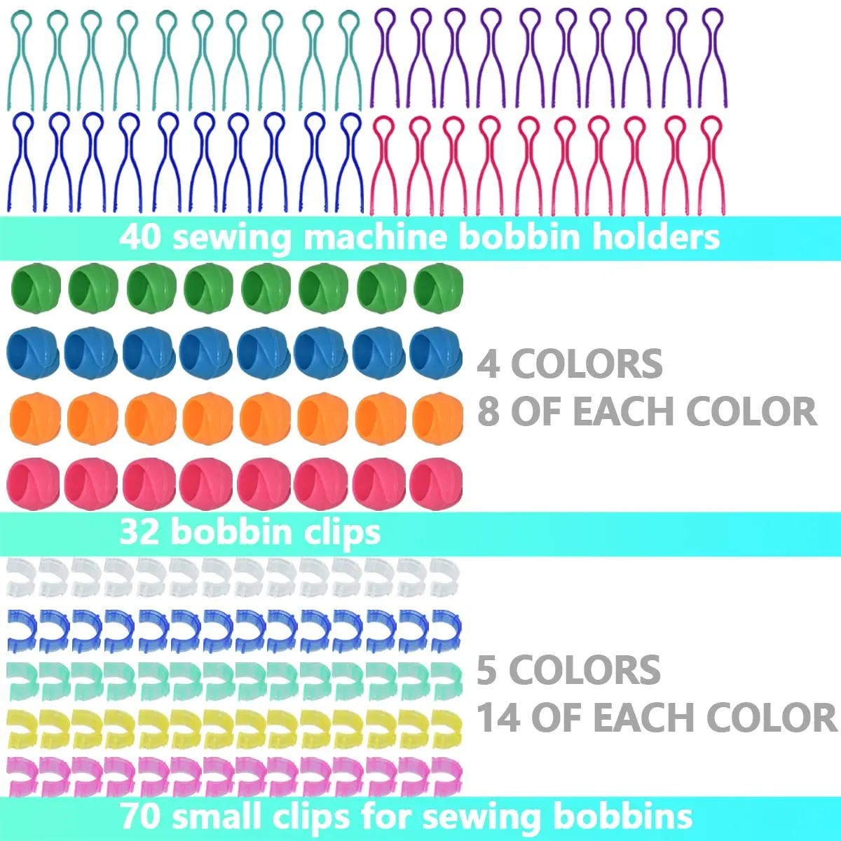 【GREAT VARIETY SEWING BUDDIES】You are going to receive 70Pcs bobbin holders clips, there are 5 colors and each color 14pcs; 32Pcs bobbin thread spool huggers, there 4 colors, and each color 8pcs; 40Pcs bobbin clips holder, there are 4 colors and each color 10pcs. All total 142pcs. Abundant variety and good for your daily uses.
