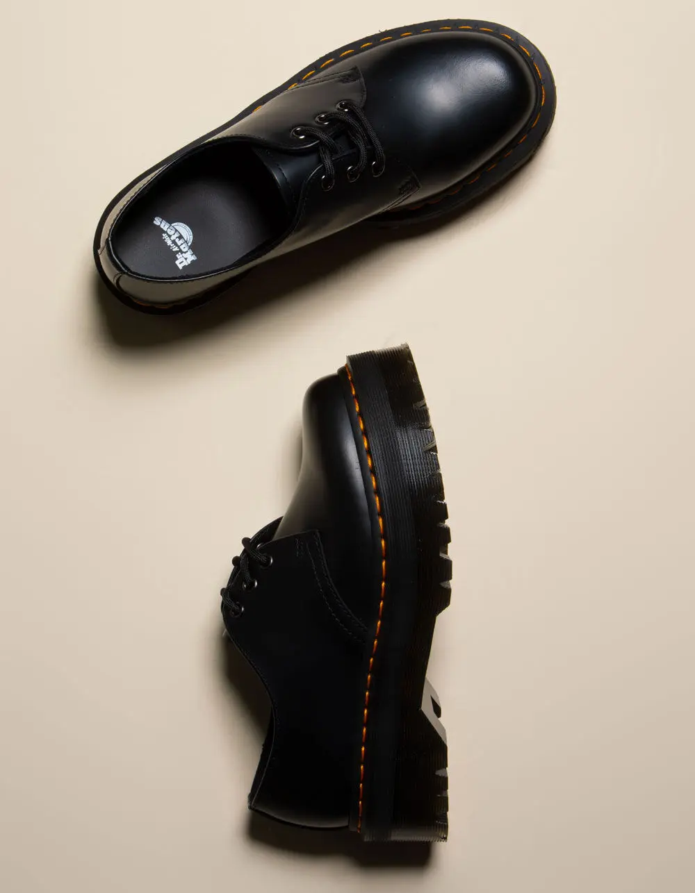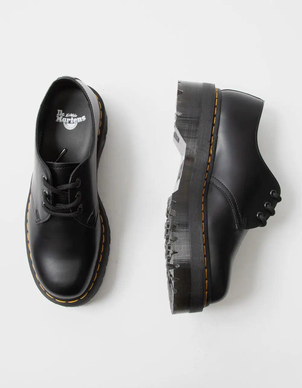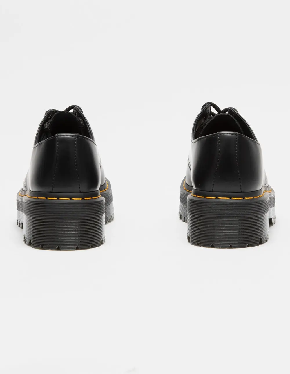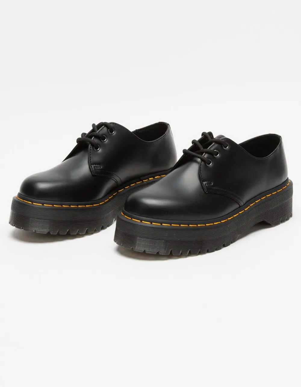 Dr. Martens 1461 Quad Smooth Leather Oxford Platform Shoes. Our classic 1461 shoe has hit new heights. Built on our highest platform to date, our 1461 Quad has been given an empowering rework. The shoes are built from Polished Smooth leather and welted in place with our unmistakable yellow stitching. A twist on the classic Dr. Martens leather: durable, with a smooth and polished finish. Polished Smooth is the original Dr. Martens leather: super durable, with a smooth finish polished to a high shine. Clean with a damp cloth and care with Dr. Martens Shoe Polish. Our Goodyear-welted lines are heat-sealed at 700°C and reinforced with our signature welt stitch. Stacked on a 1.5in Quad sole. Imported. NOTE: Runs large; size down if you are between sizes.